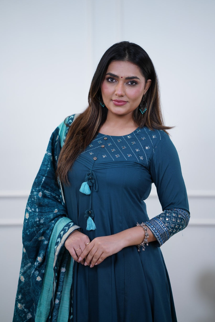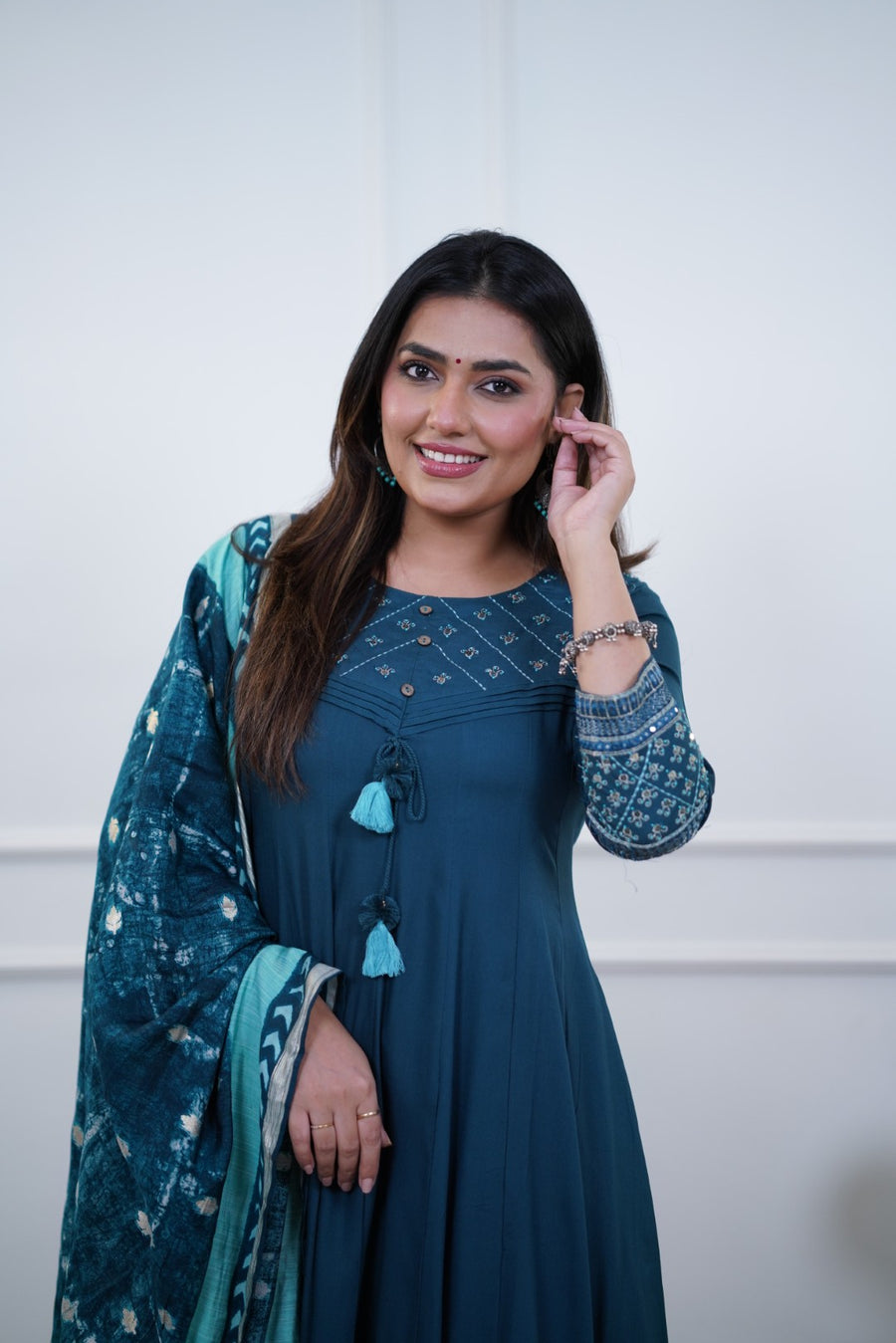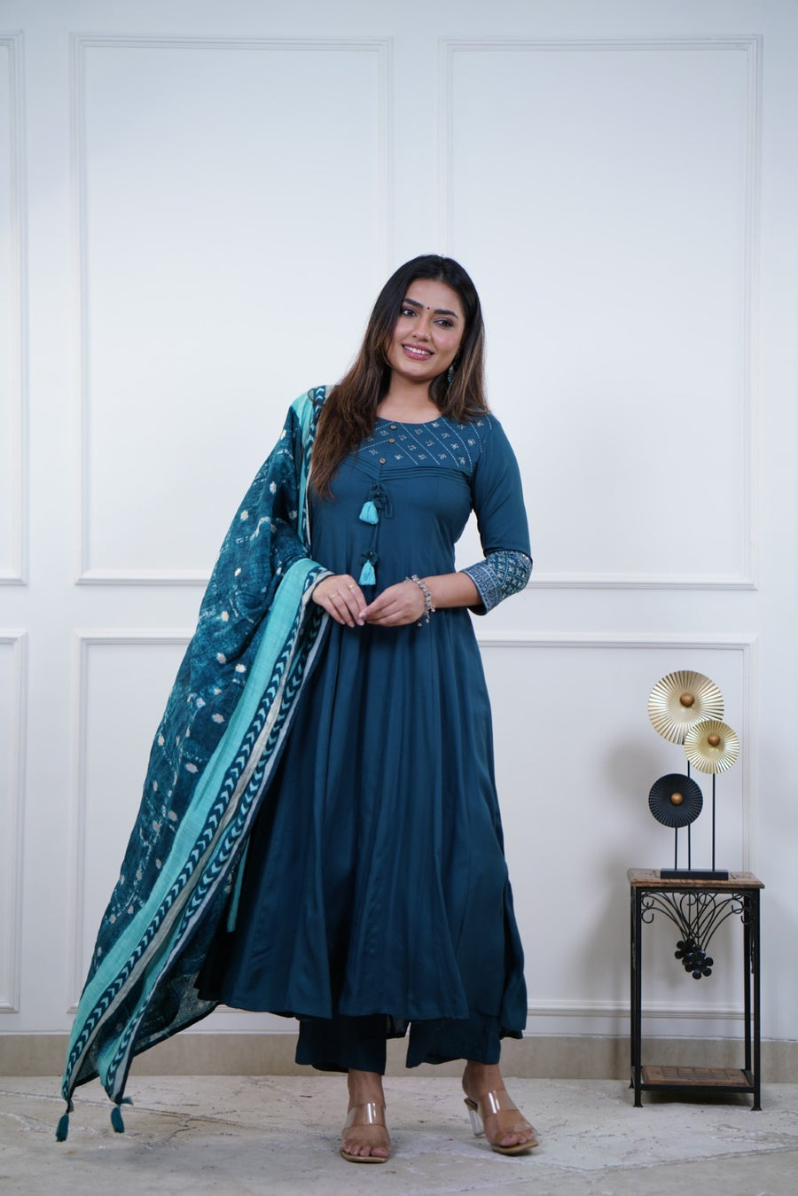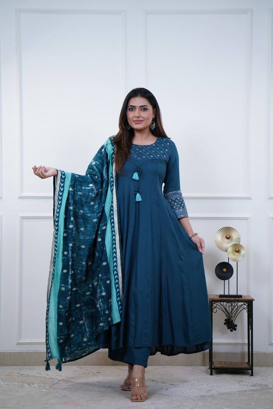 Elevate your ethnic wardrobe with this sophisticated Dupatta Pant Set. Crafted from premium cotton fabric for exceptional comfort and breathability. The ensemble features a well-proportioned kurta measuring 49 inches in length, paired with complementary pants measuring 38 inches. Available