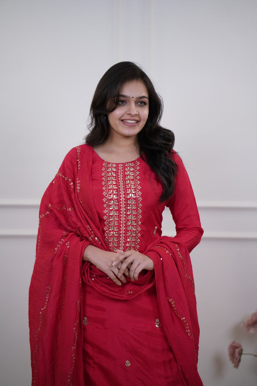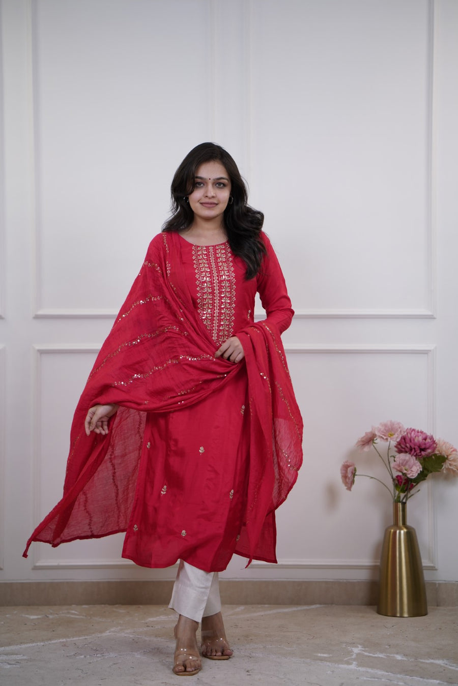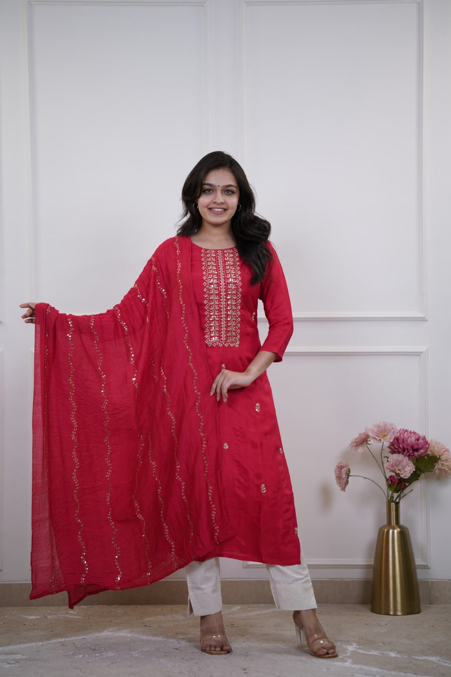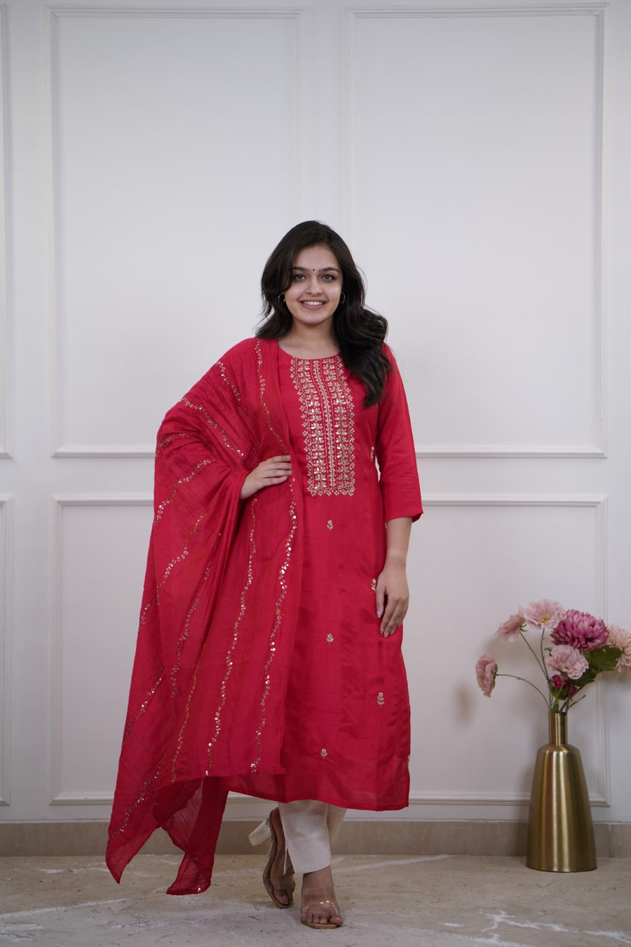 Straight Silk Kurta Set and Silk dupatta – a classic and elegant Indian ethnic look. Straight-cut kurta with side slits. Small scattered embroidered motifs throughout the body for added detailing.