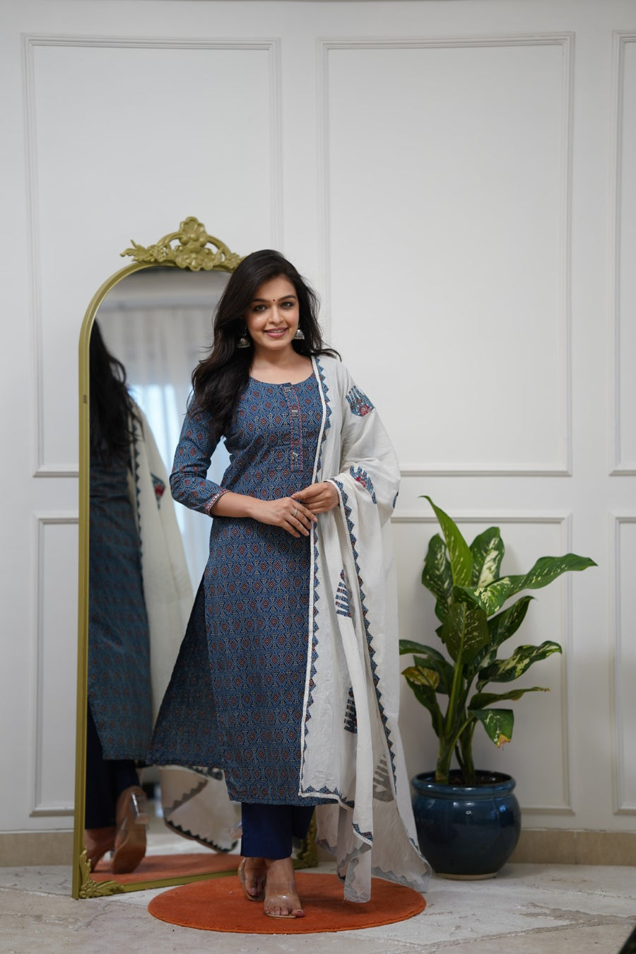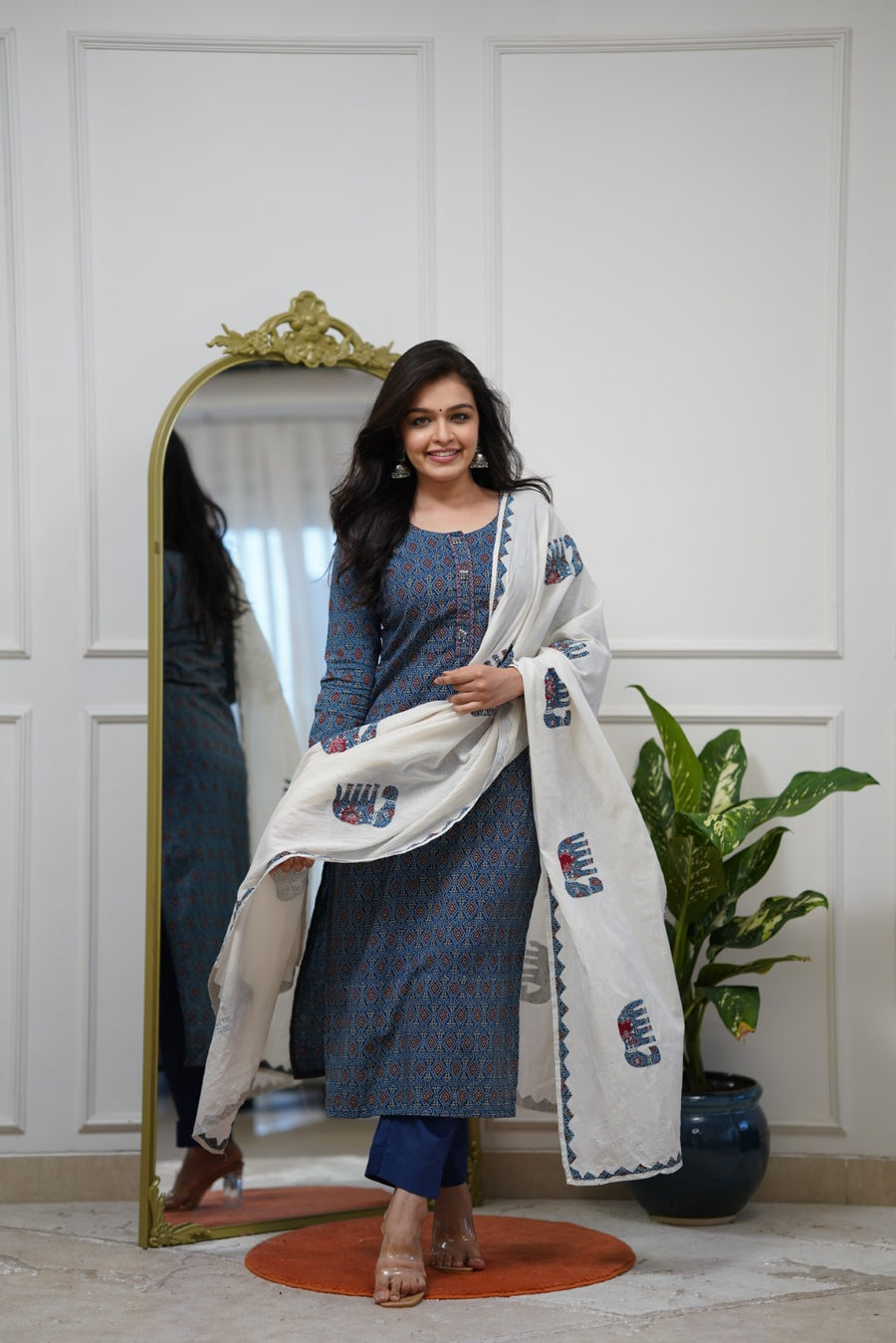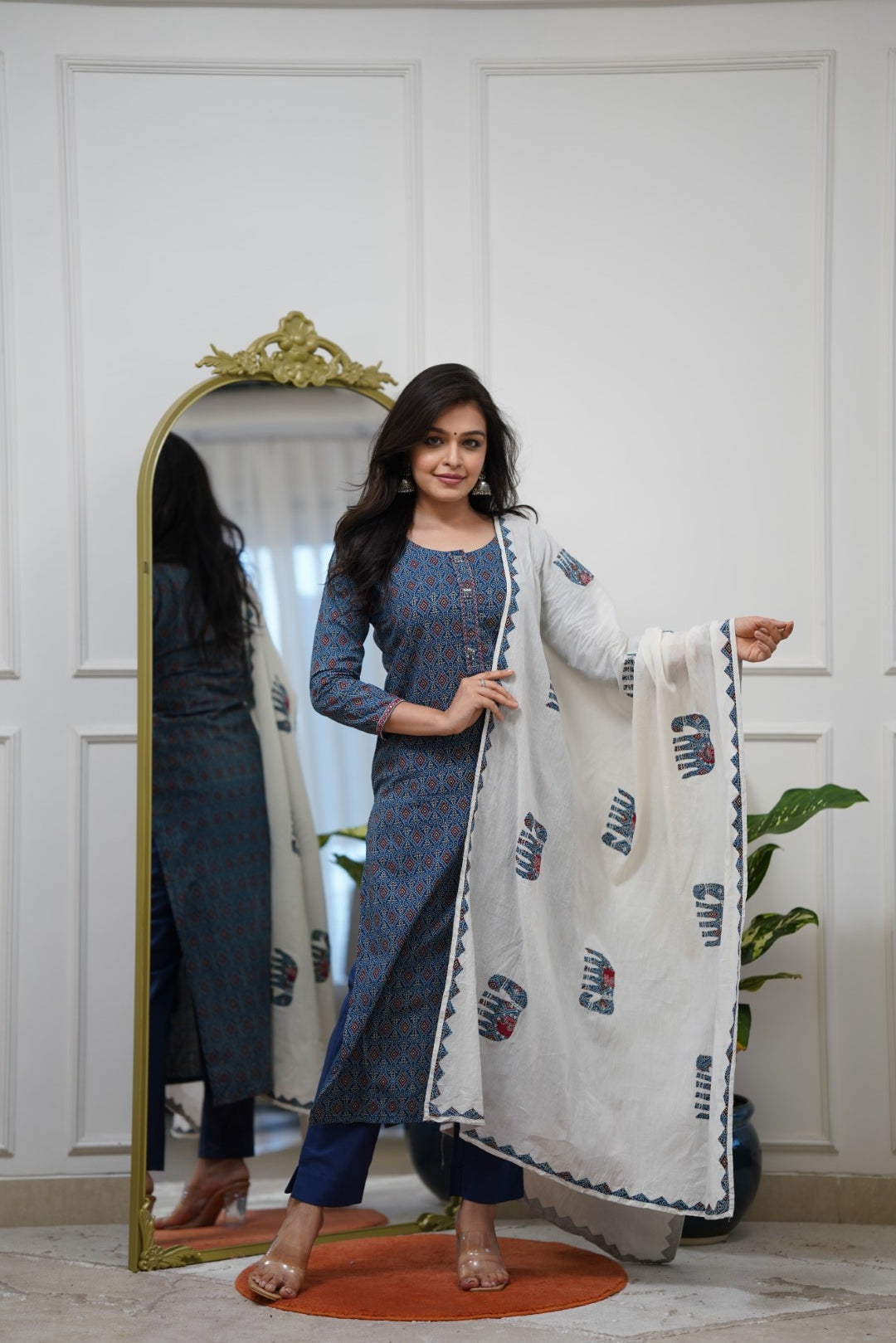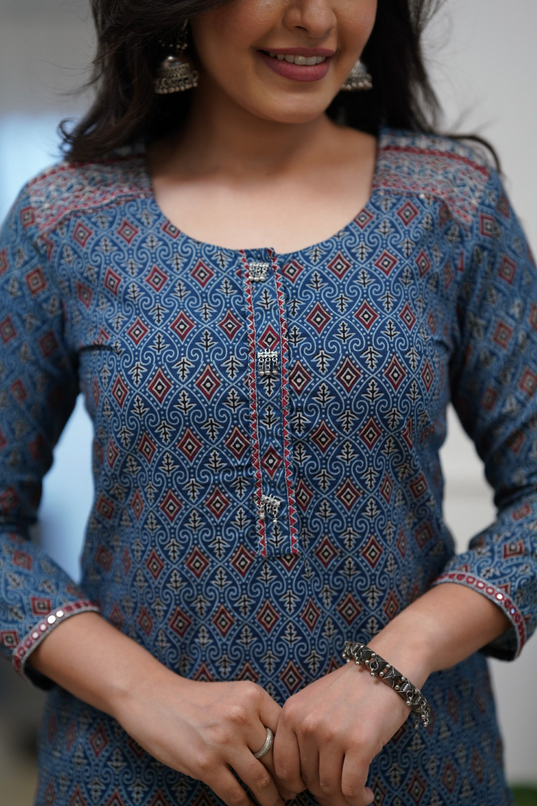 This Ajrakh set features intricate patchwork detailing, blending traditional craftsmanship with contemporary style. Available in sizes 36 to 44, the kurta measures 46 inches in length, paired with pants of 38 inches, ensuring a comfortable and flattering fit. Perfect for those who appreciate artisanal textiles and elegant design.