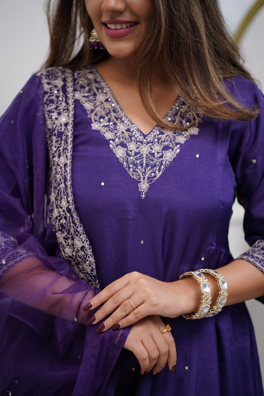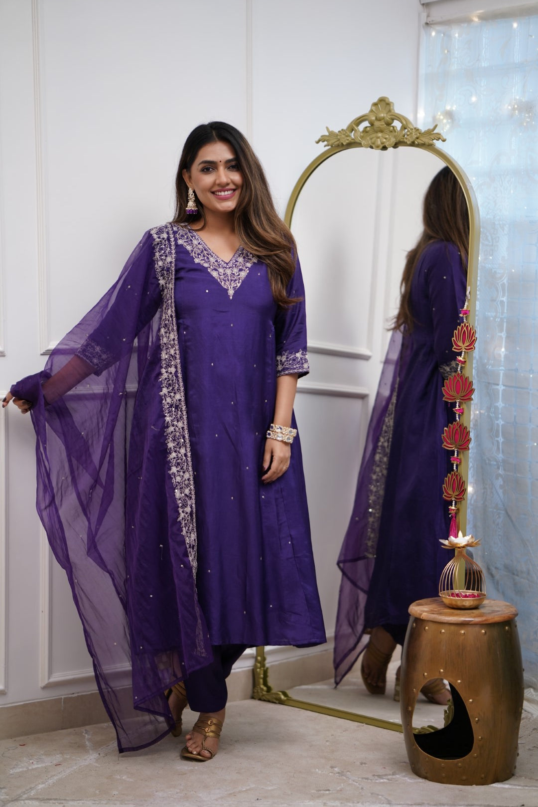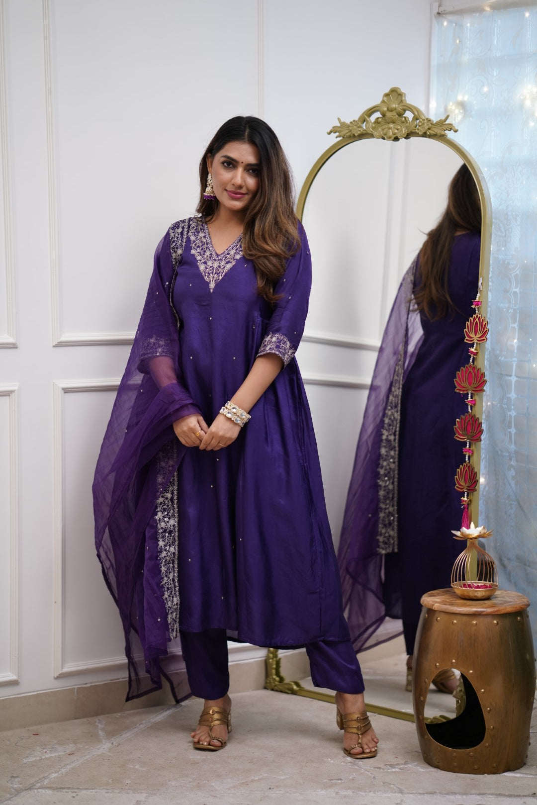 Deep purple kurta set with intricate silver embroidery on neckline and sleeves, paired with matching pants and sheer embroidered dupatta.