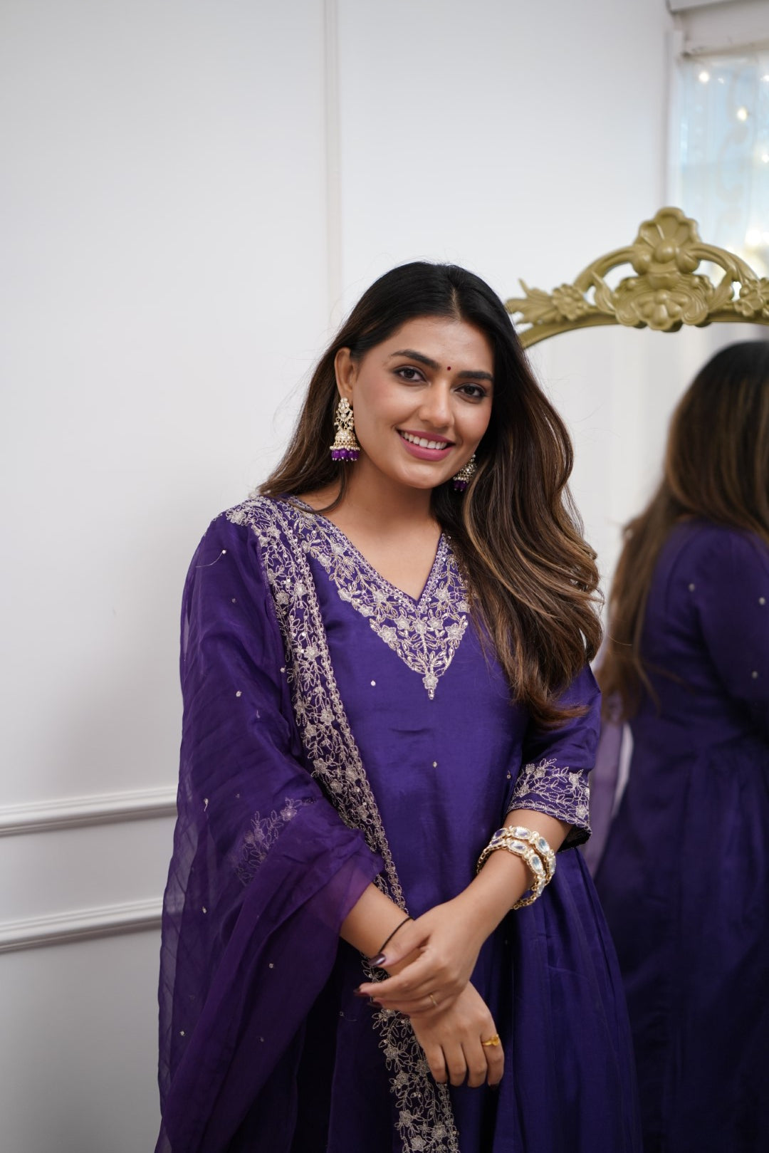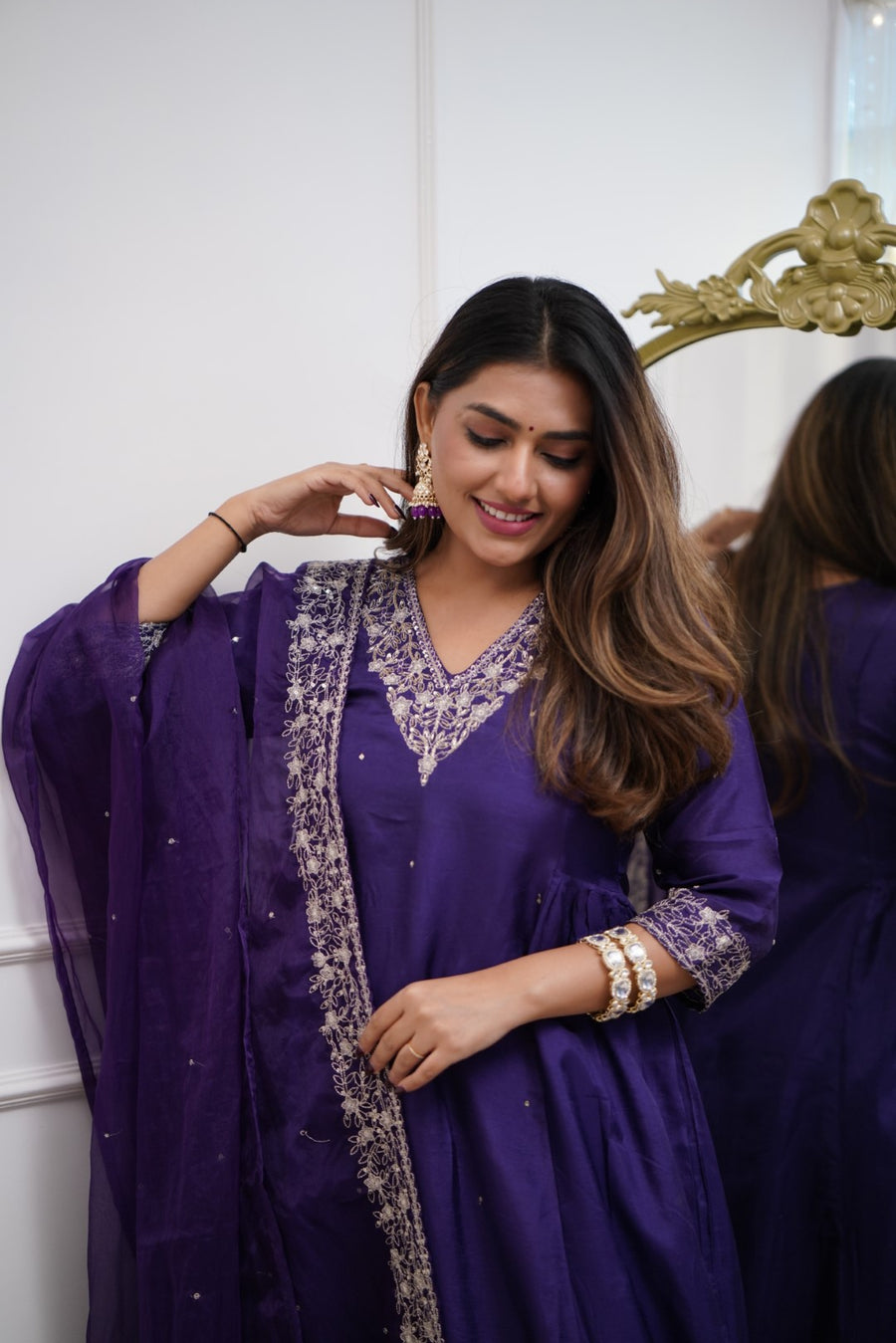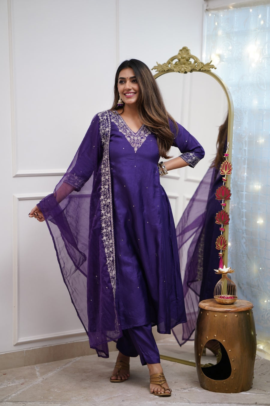 Deep purple kurta set with intricate silver embroidery on neckline and sleeves, paired with matching pants and sheer embroidered dupatta.