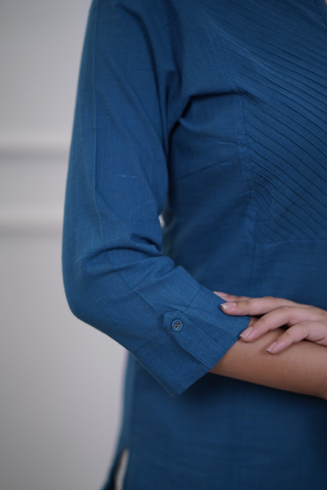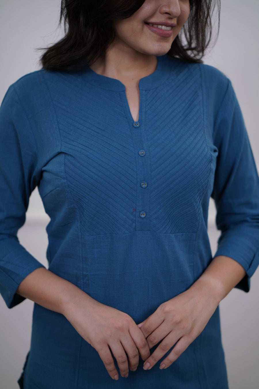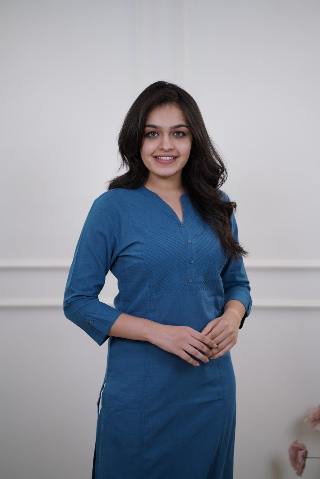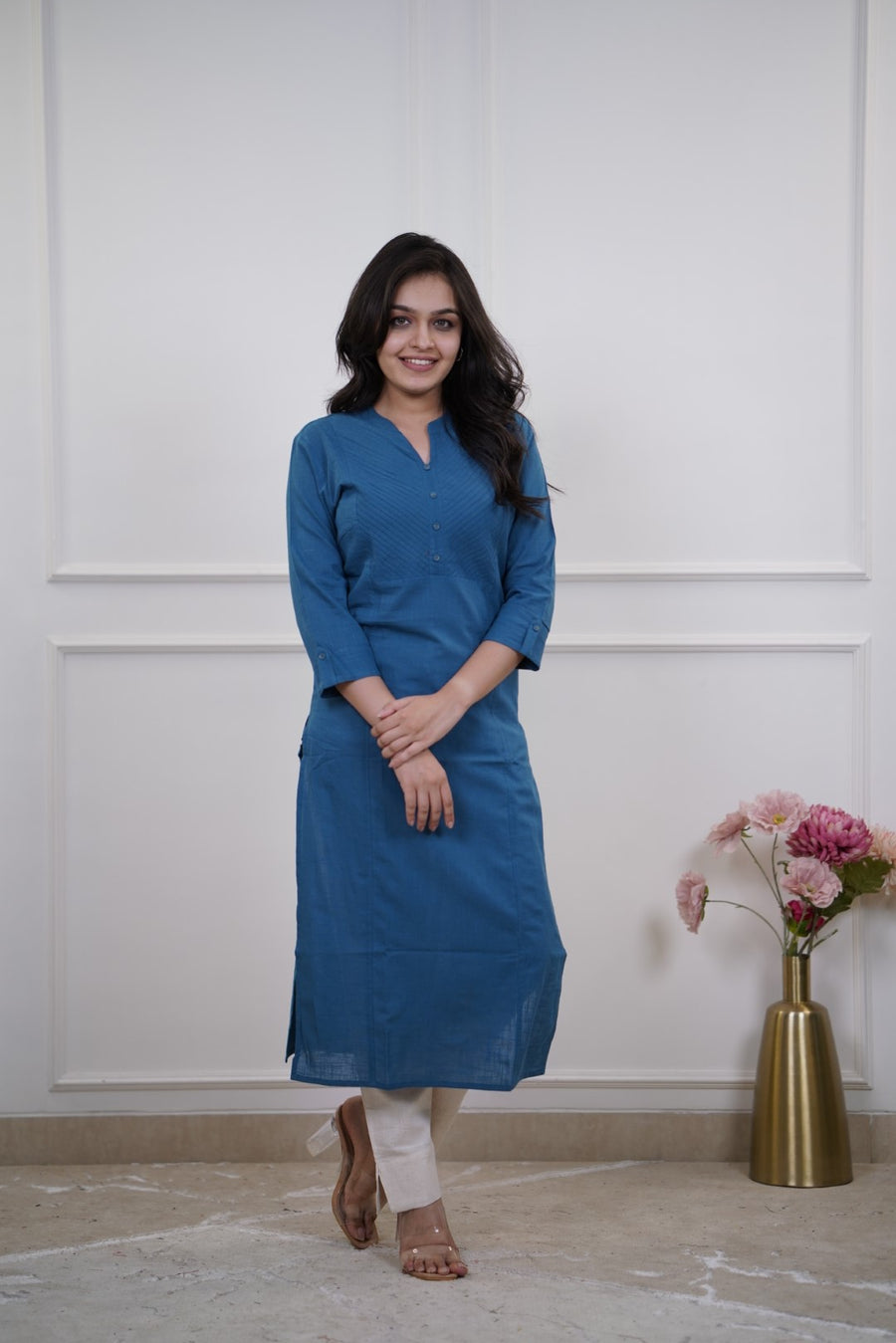 Rich blue, solid color. Straight-cut kurta with a clean and minimalist design. Mandarin collar with a notch neckline. Button placket with small matching buttons for added texture, though purely decorative. This kurta offers a refined, contemporary everyday ethnic look.
