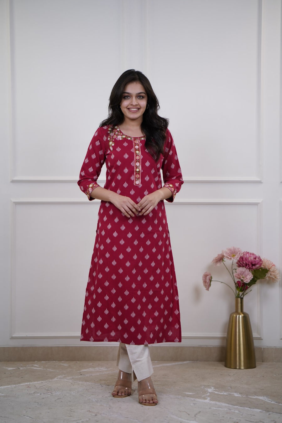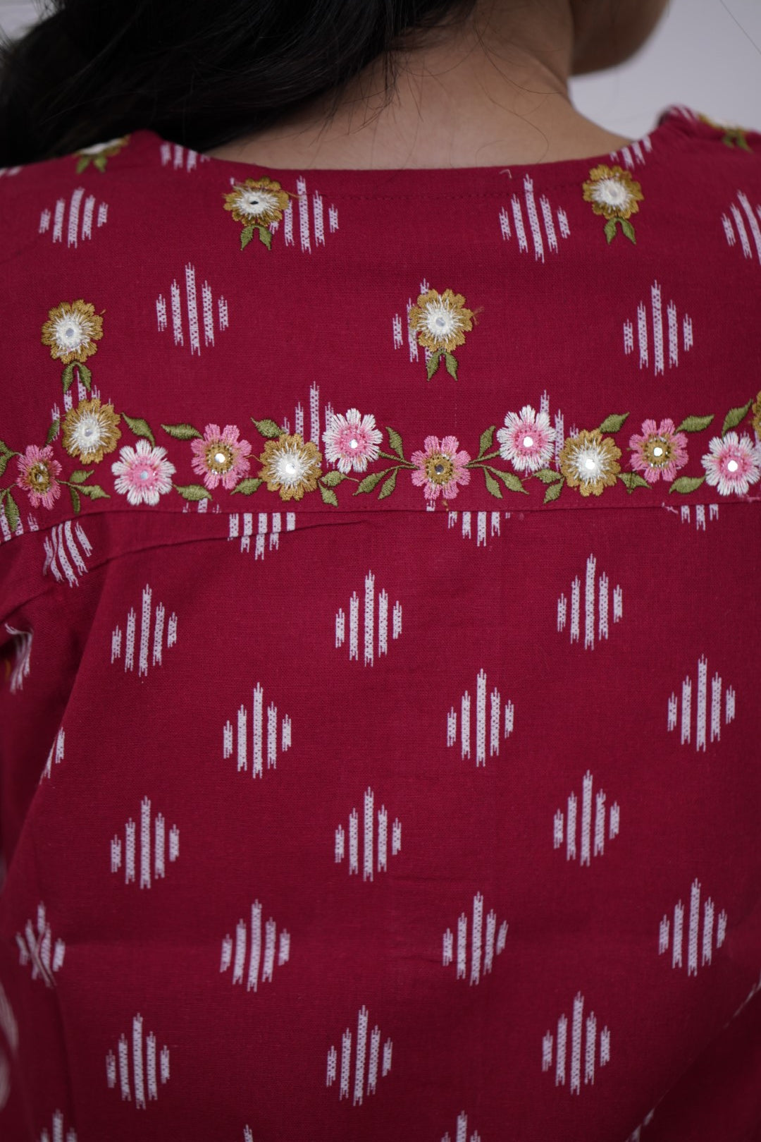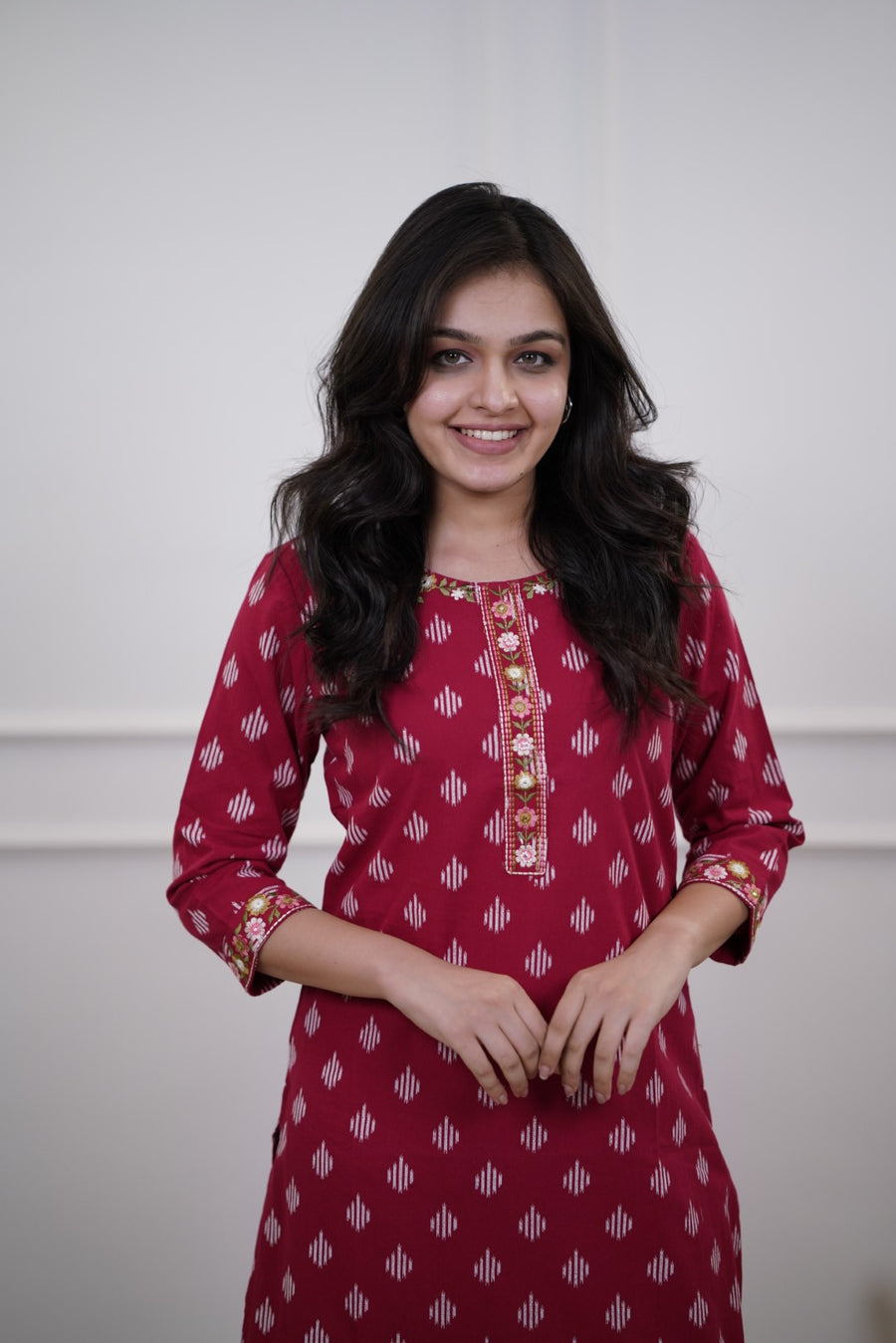 Here are the detailed features of the deep red kurta. Cotton and suitable for regular wear. Straight-cut kurta with a structured yet comfortable silhouette and thread embroidery detailing (front and back). Embellished with tiny mirror or sequin accents (subtle but festive).