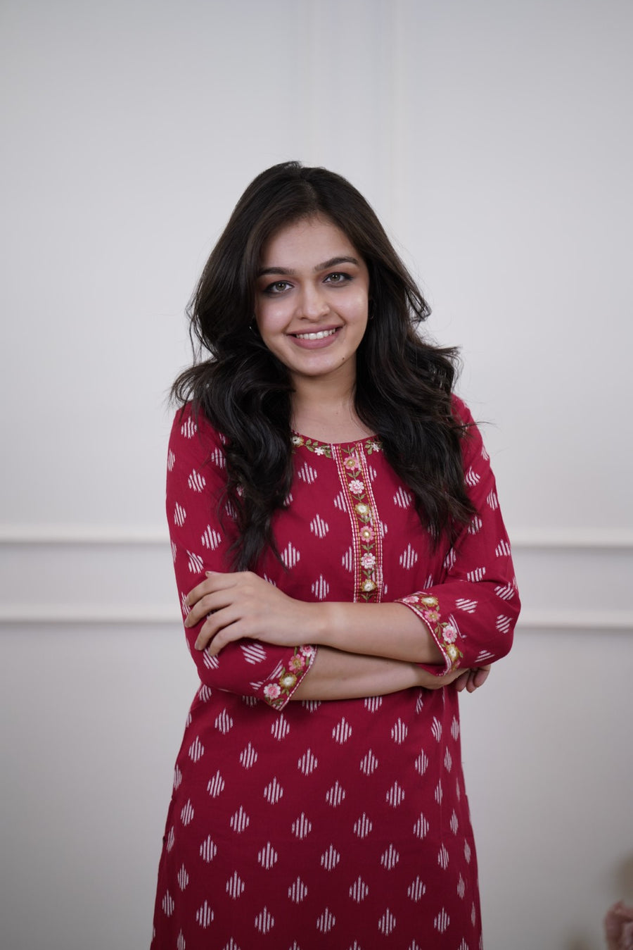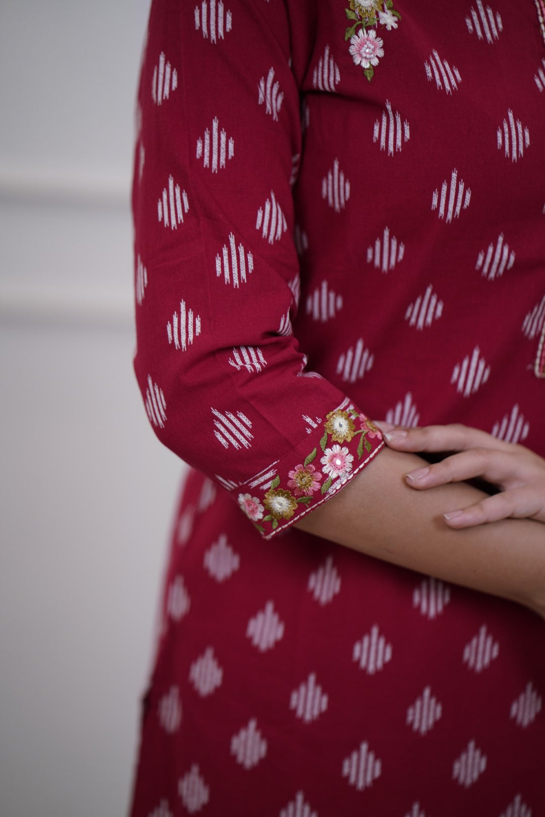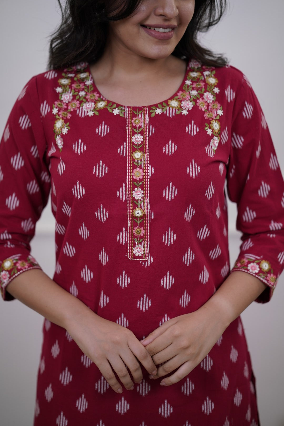 Here are the detailed features of the deep red kurta. Cotton and suitable for regular wear. Straight-cut kurta with a structured yet comfortable silhouette and thread embroidery detailing (front and back). Embellished with tiny mirror or sequin accents (subtle but festive).