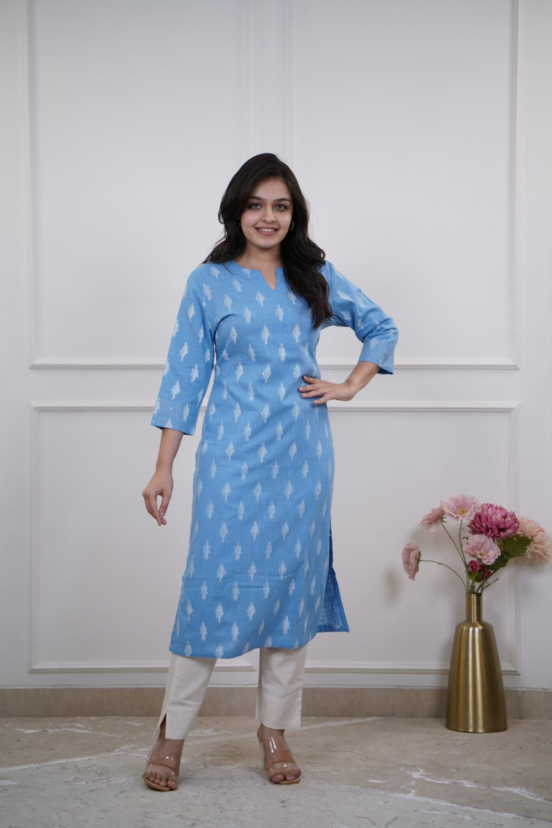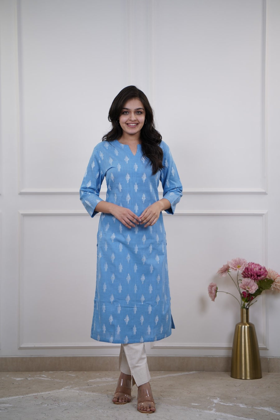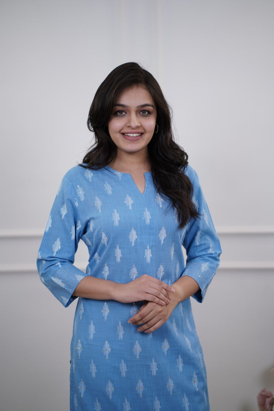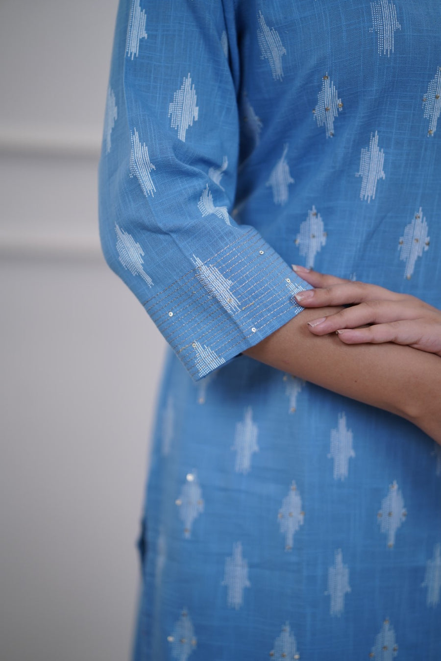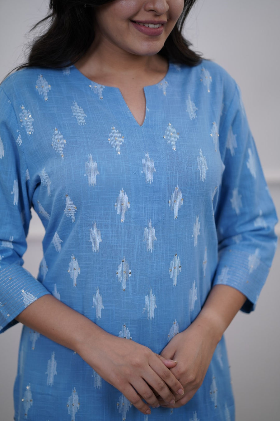 Sky blue cotton kurta with white ikat prints, three-quarter sleeves, straight hemline, and keyhole neckline.