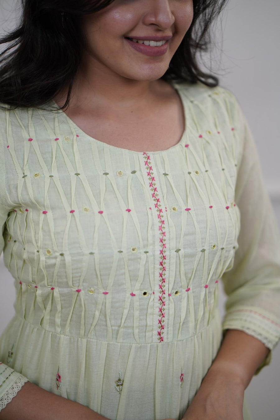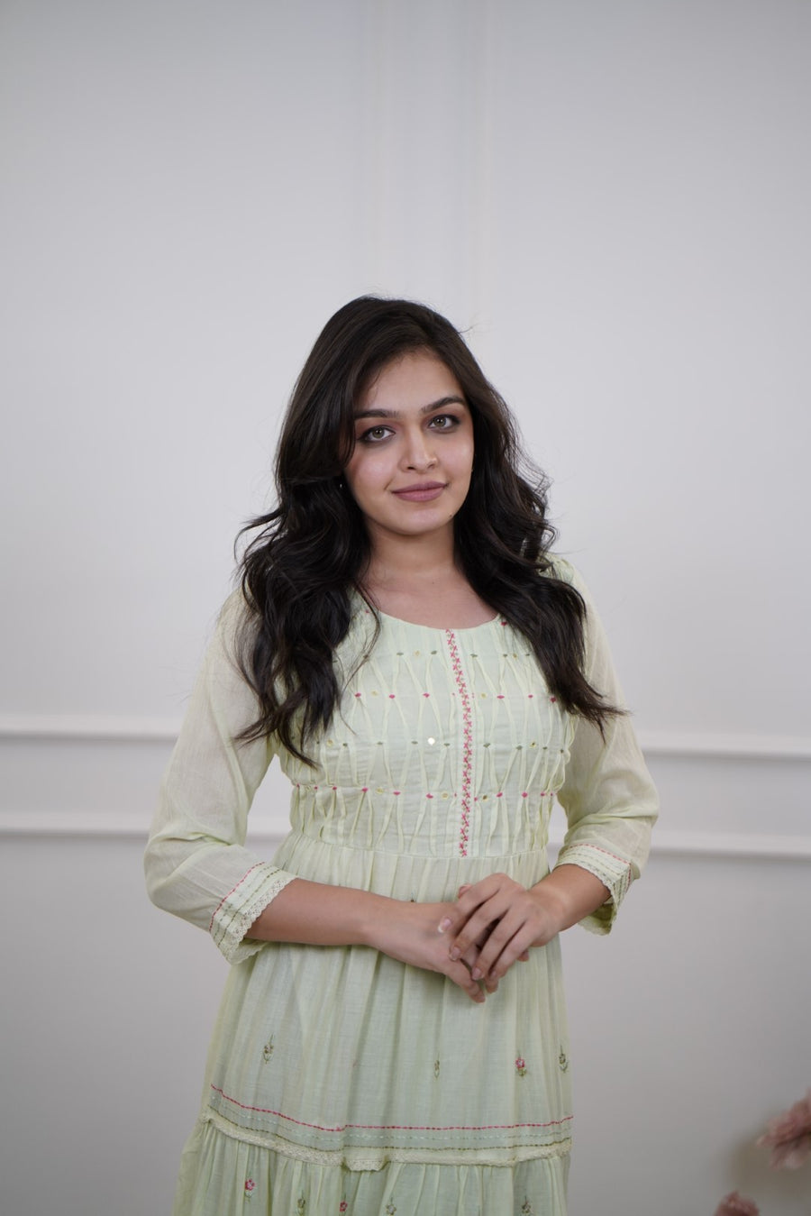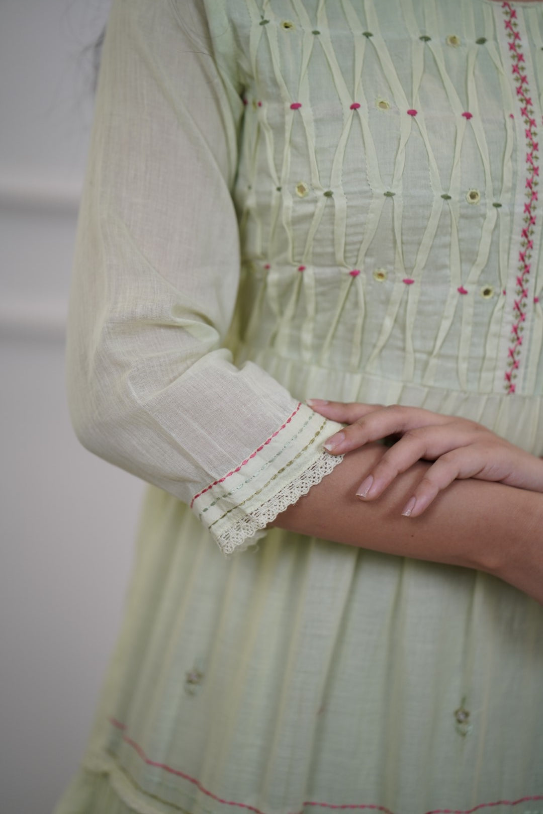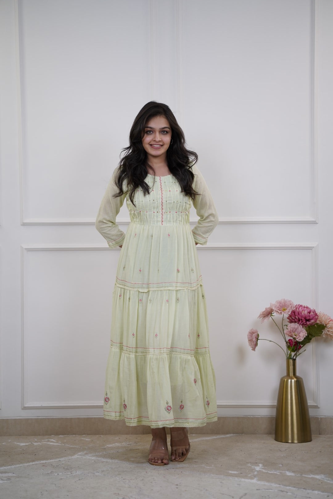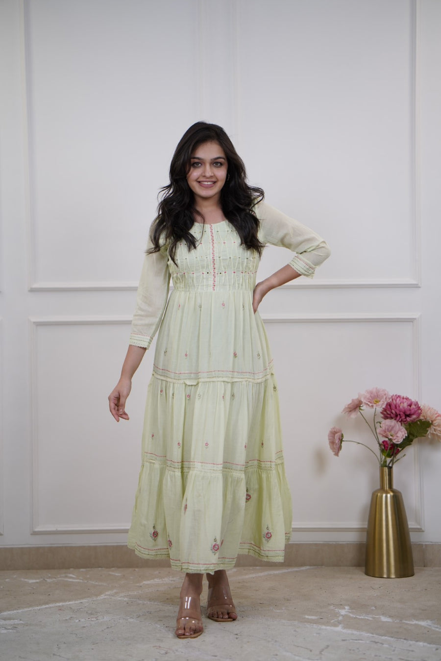 Anarkali-style long dress with a relaxed, tiered silhouette. Light pastel green (lemony mint tone). Lightweight and breathable in Mulcotton Fabric. Full-length sleeves, semi-sheer with embroidered cuff detailing. Small floral embroidered motifs scattered throughout the dress.