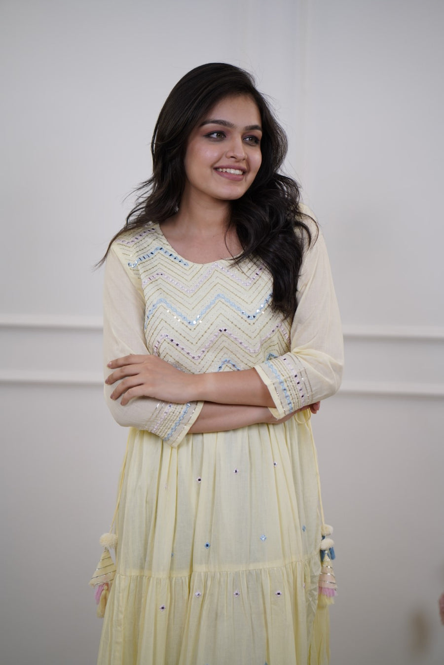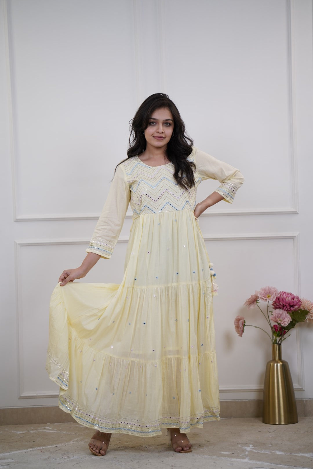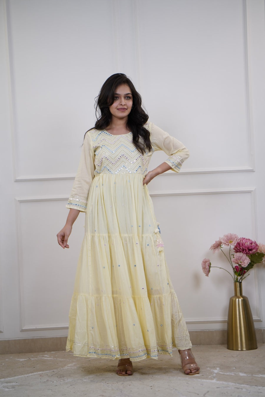 Flowy tiered Anarkali-style dress with a flared hem. Soft pastel yellow. Round neckline. Three-quarter sleeves with mirror work and embroidered detailing on the cuffs. Chevron-pattern embroidery in pastel blue, white, and silver with mirror embellishments. Subtle scattered mirror embellishments and thread embroidery.