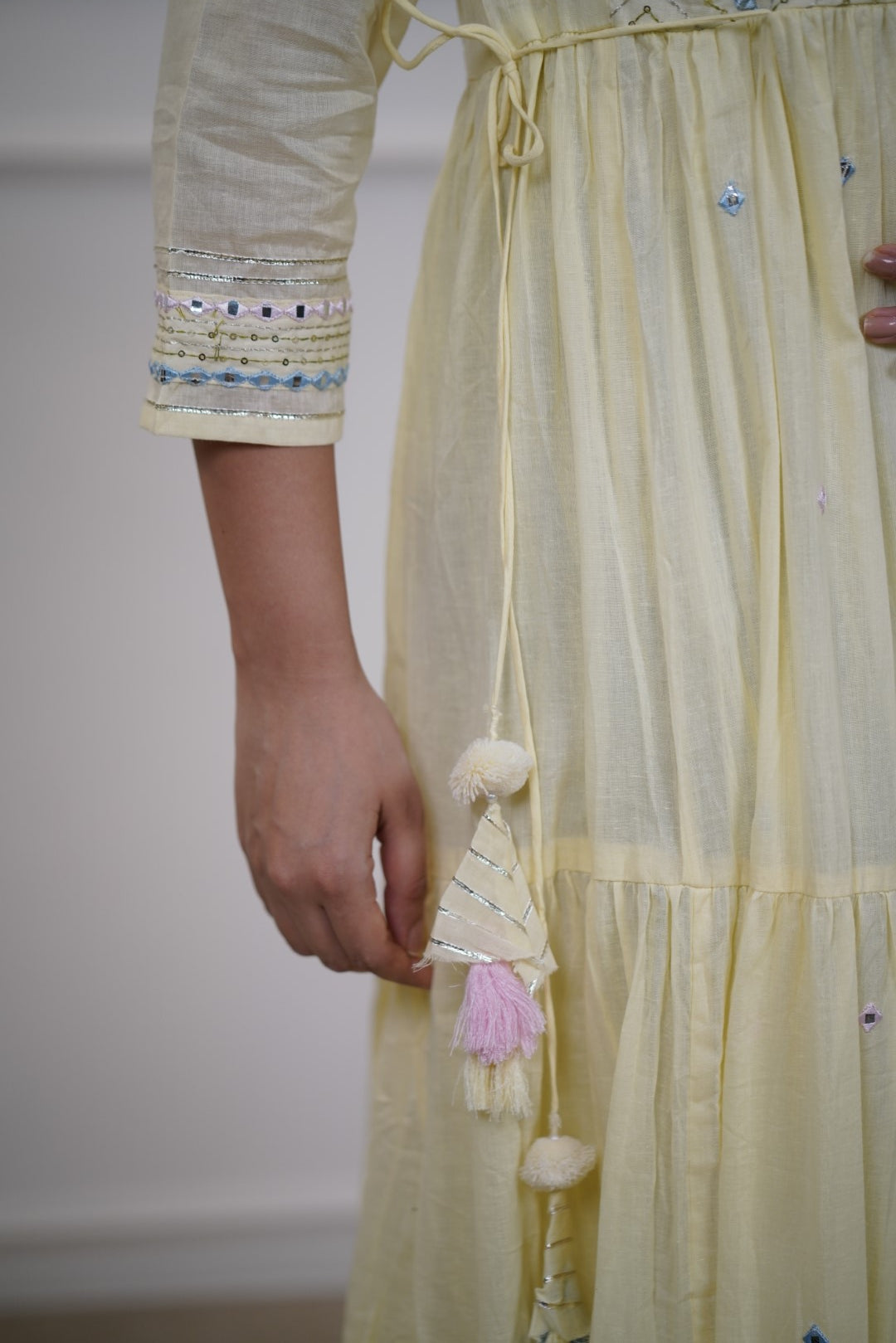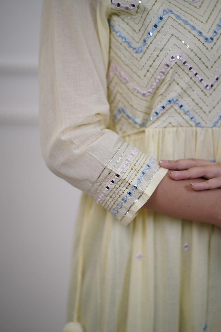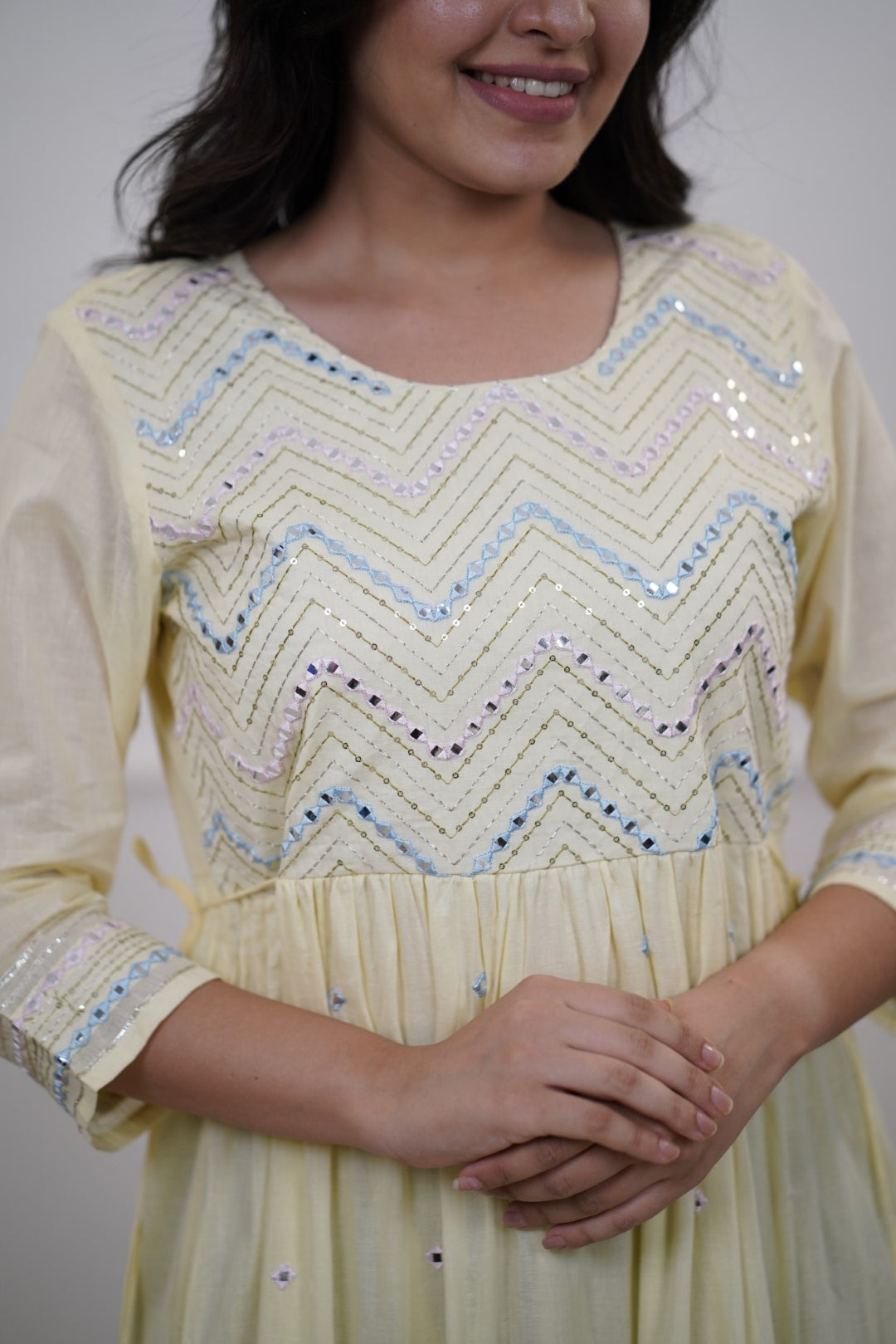 Flowy tiered Anarkali-style dress with a flared hem. Soft pastel yellow. Round neckline. Three-quarter sleeves with mirror work and embroidered detailing on the cuffs. Chevron-pattern embroidery in pastel blue, white, and silver with mirror embellishments. Subtle scattered mirror embellishments and thread embroidery.