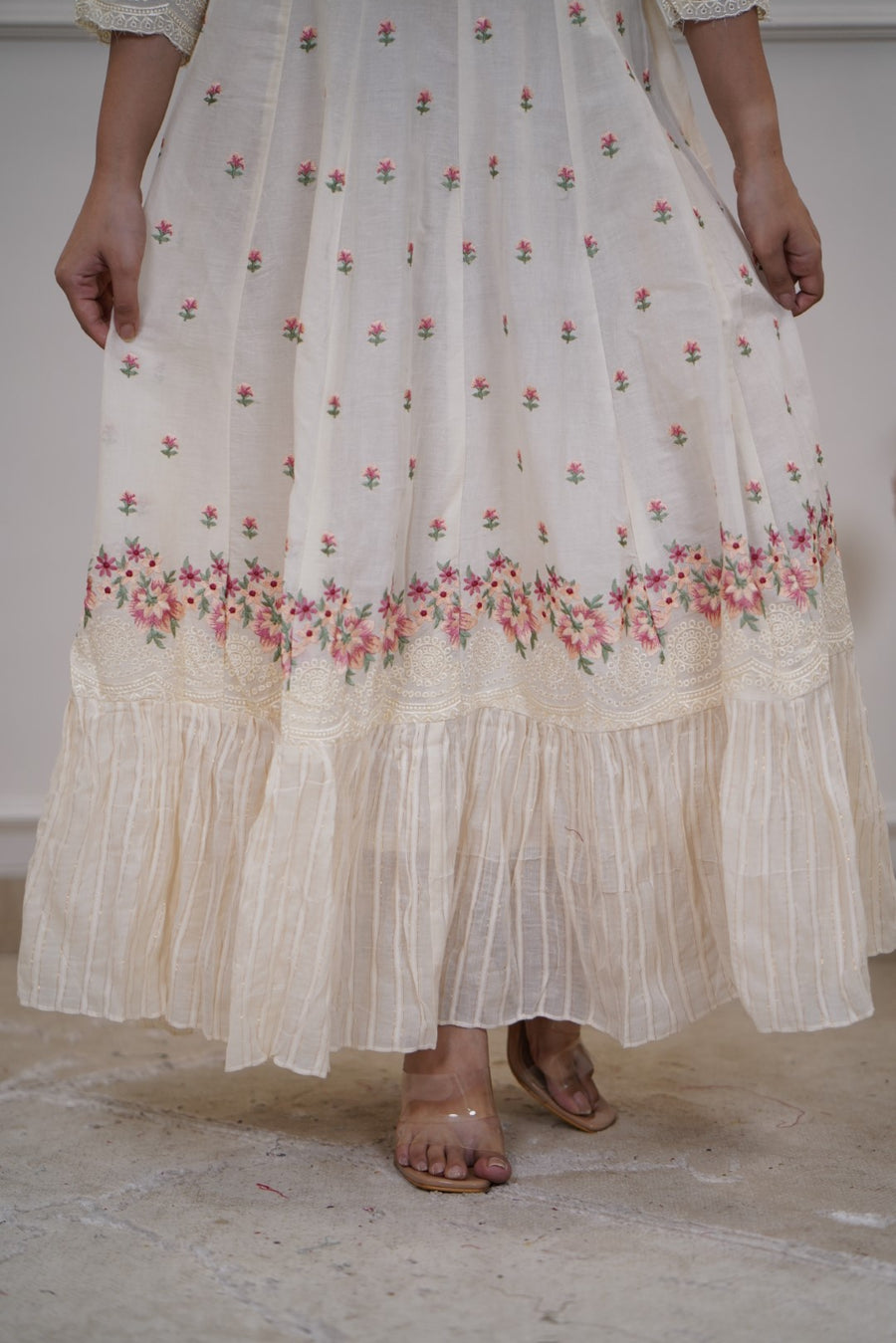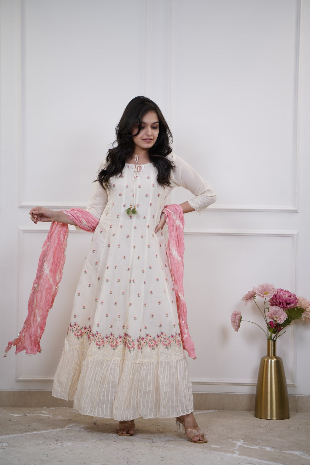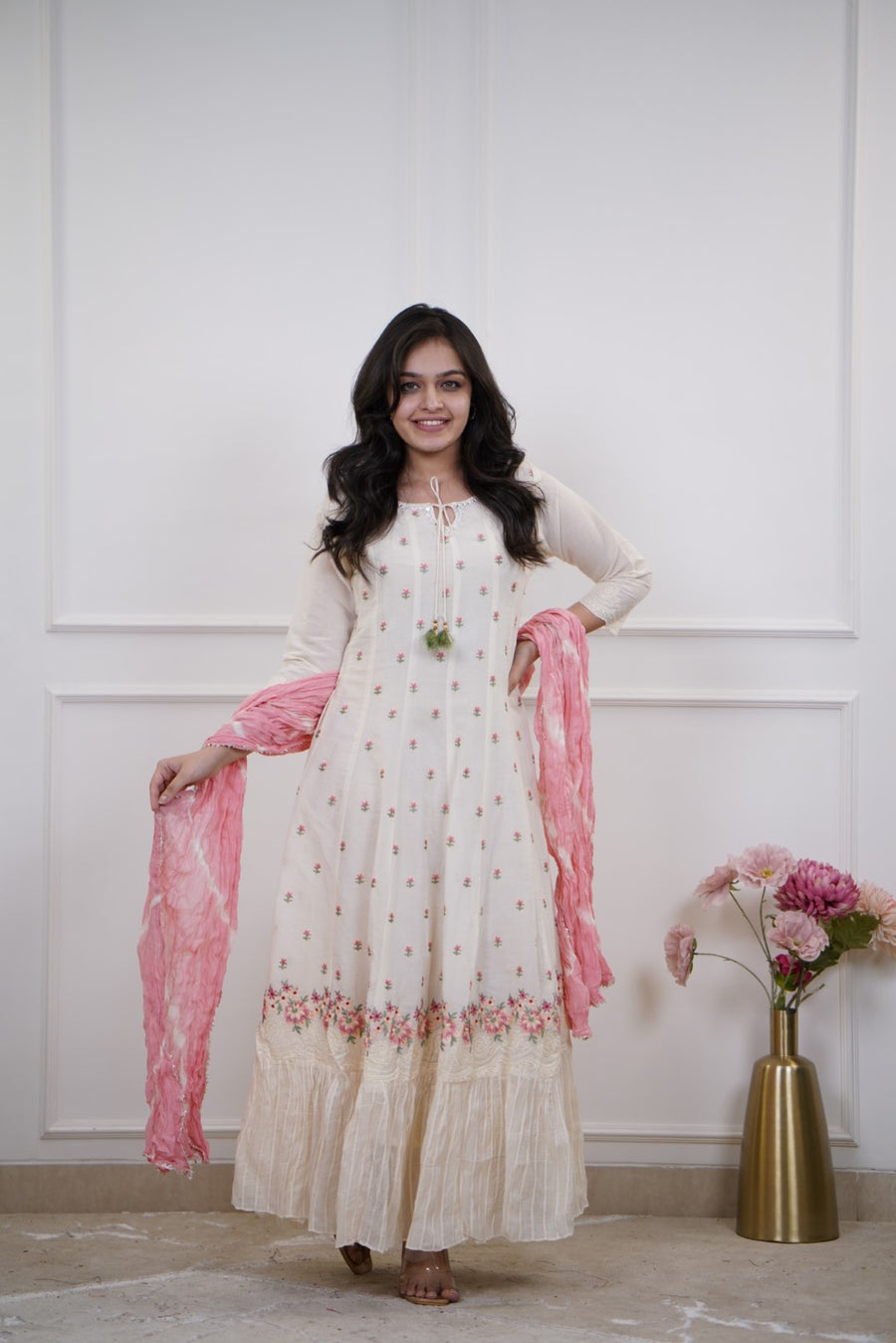Flowy Anarkali-style long dress with dupatta. Soft ivory base with pink floral Embroidery With Lining. Lightweight cotton with crinkled finish at the hem. Fitted bodice with a flared, panelled lower portion. Round neckline with front tie-up and tassel strings.Wide crinkled border at the bottom.