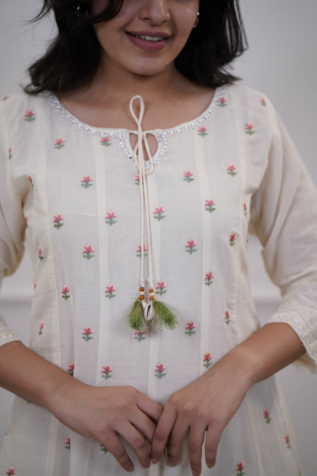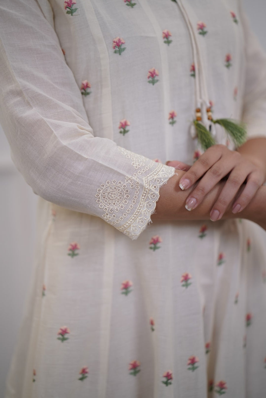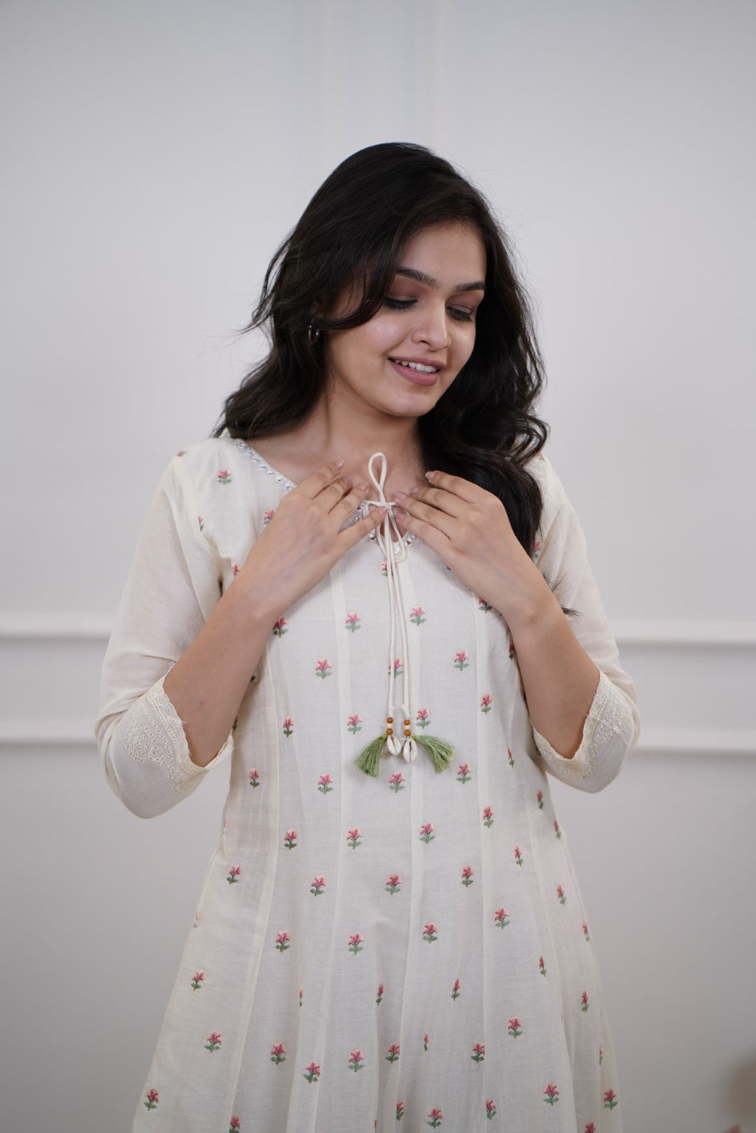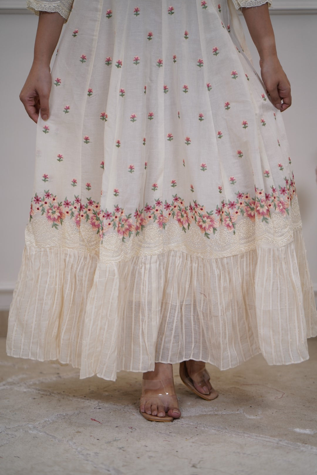 Flowy Anarkali-style long dress with dupatta. Soft ivory base with pink floral Embroidery With Lining. Lightweight cotton with crinkled finish at the hem. Fitted bodice with a flared, panelled lower portion. Round neckline with front tie-up and tassel strings.Wide crinkled border at the bottom.