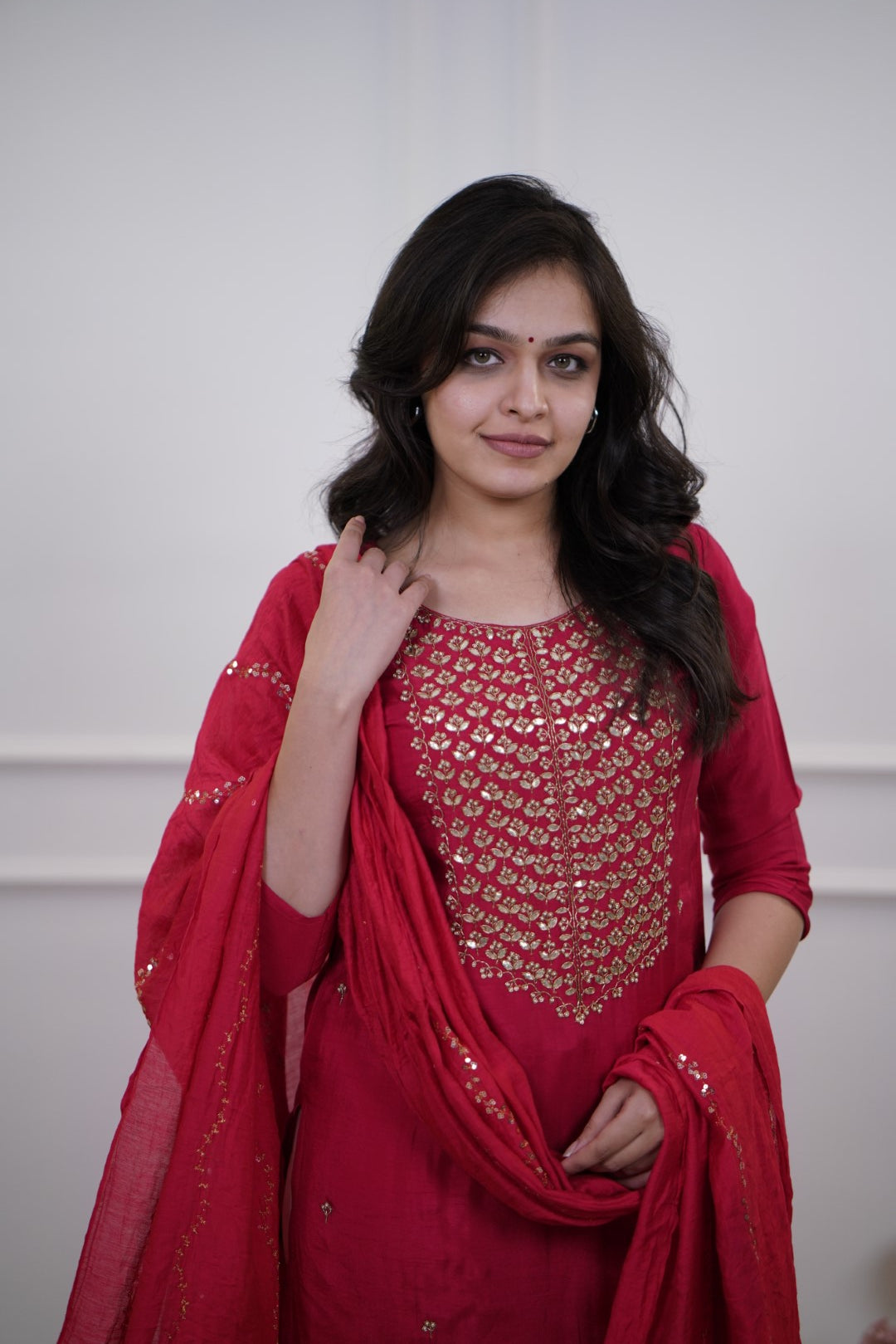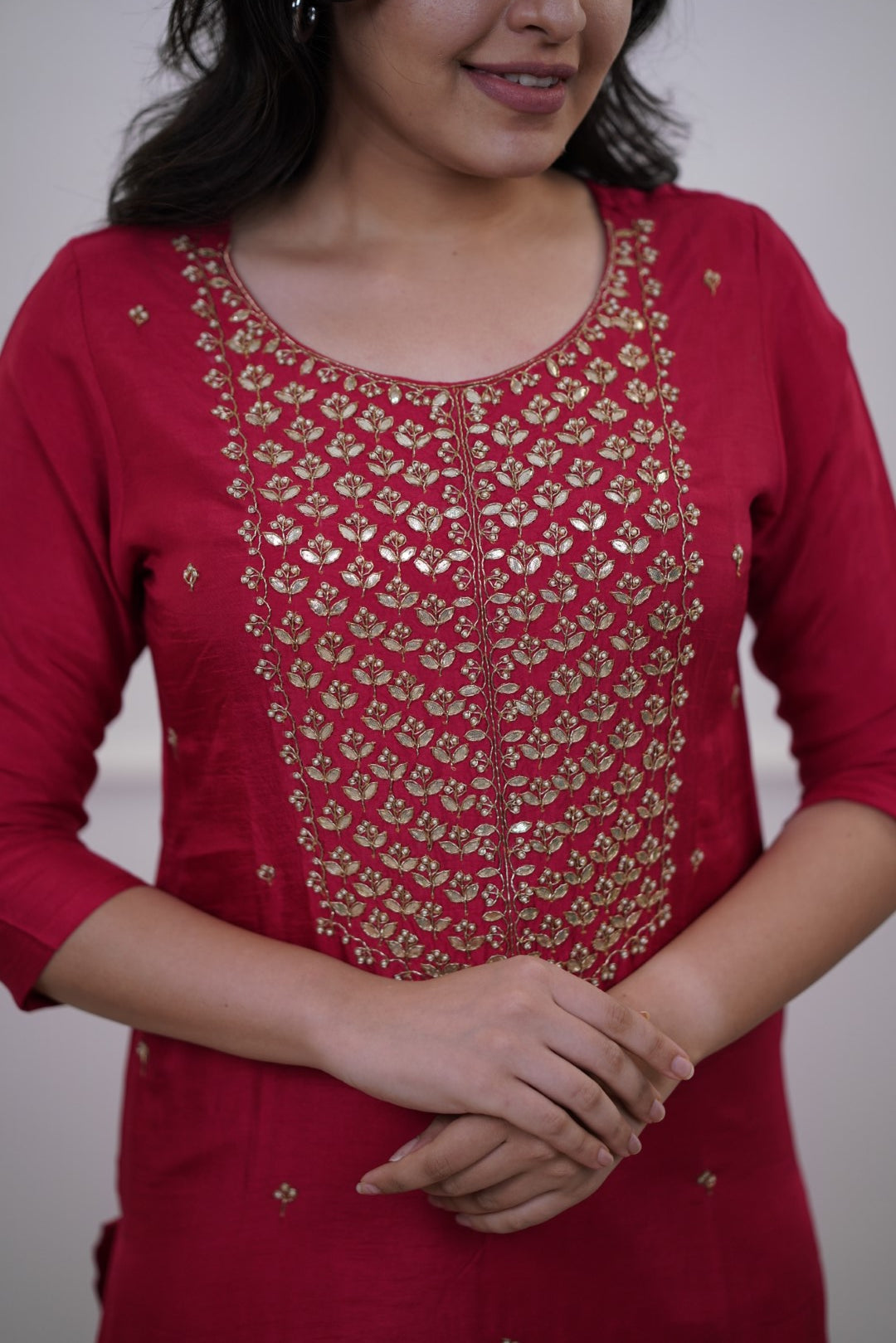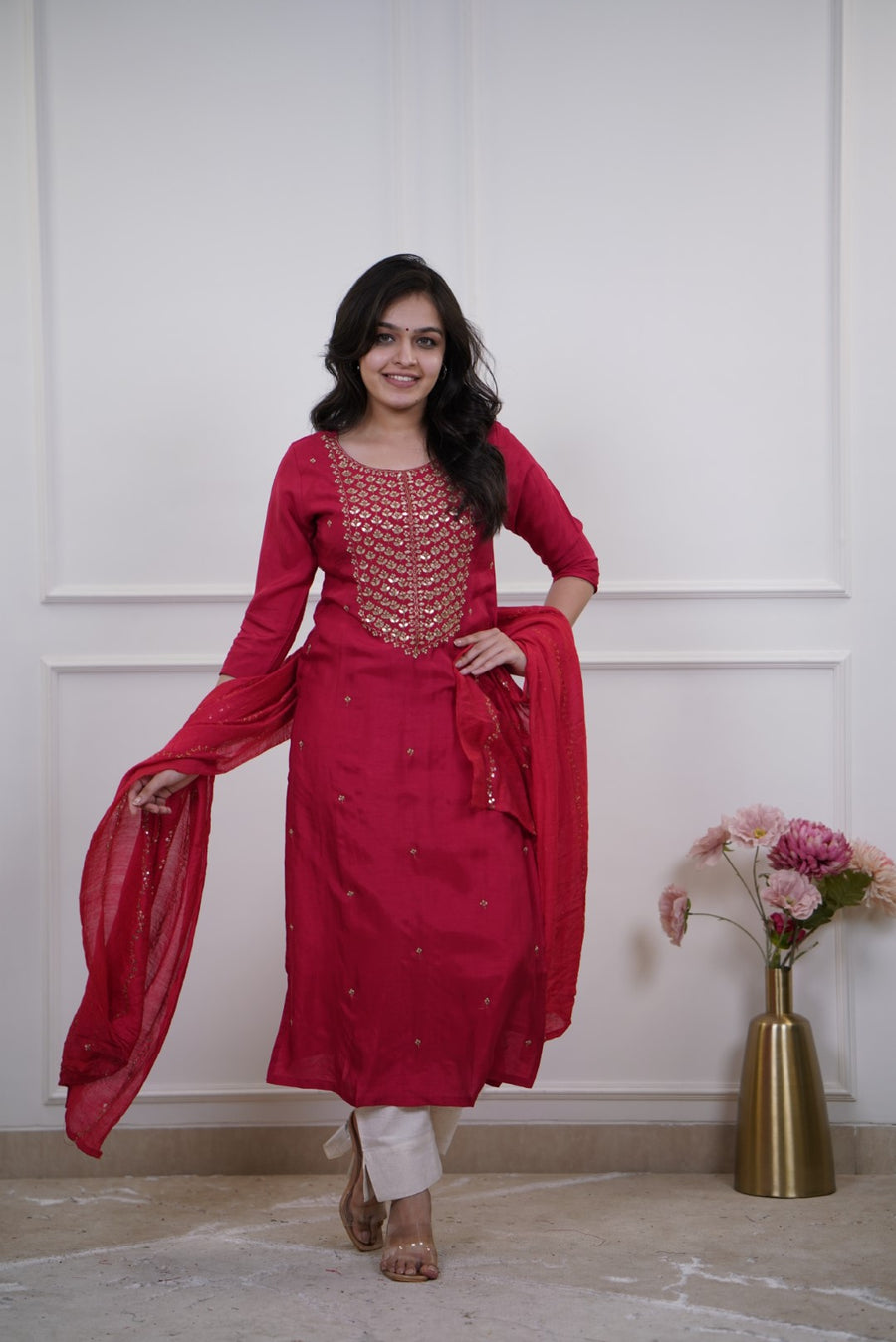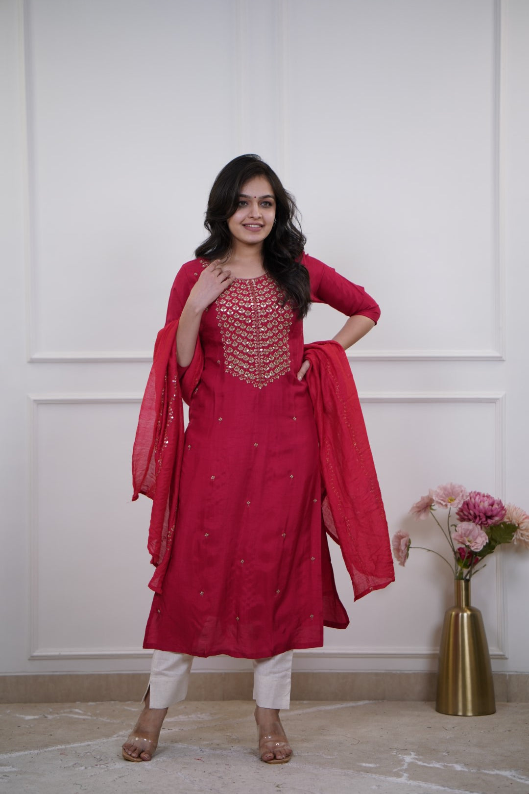 Straight Silk Kurta Set and Silk dupatta – a classic and elegant Indian ethnic look. Straight-cut kurta with side slits. Small scattered embroidered motifs throughout the body for added detailing.