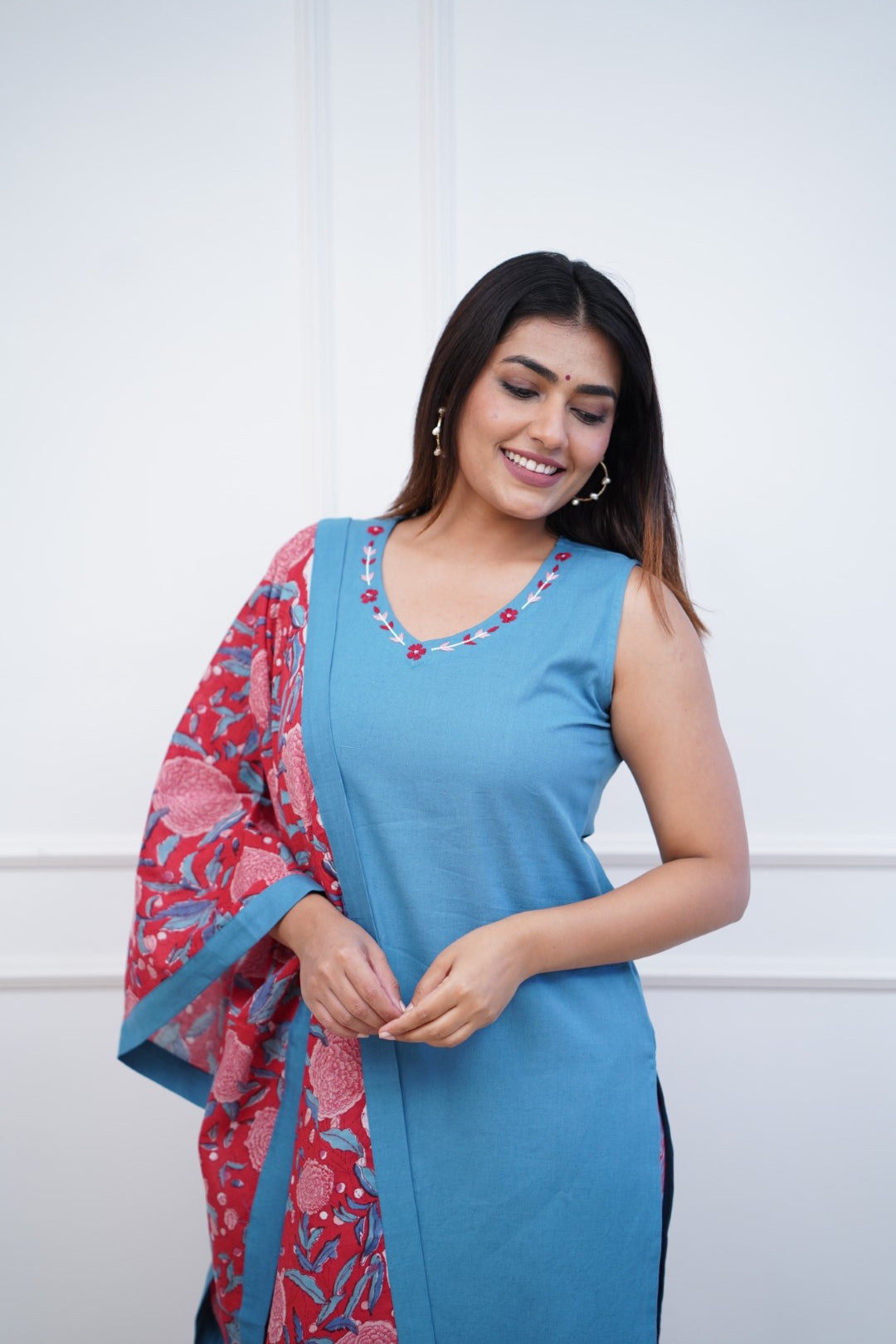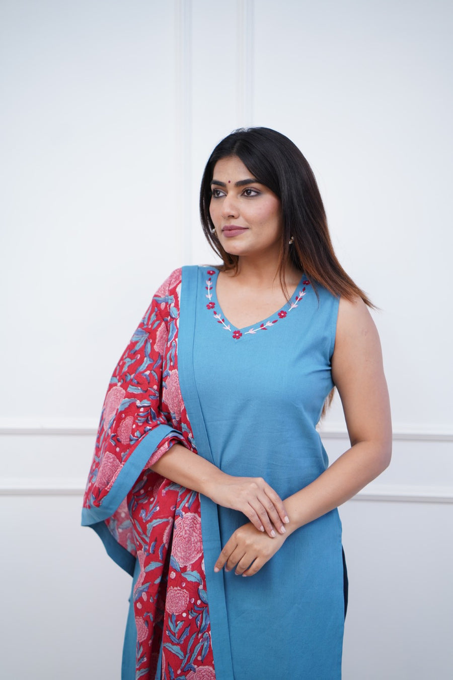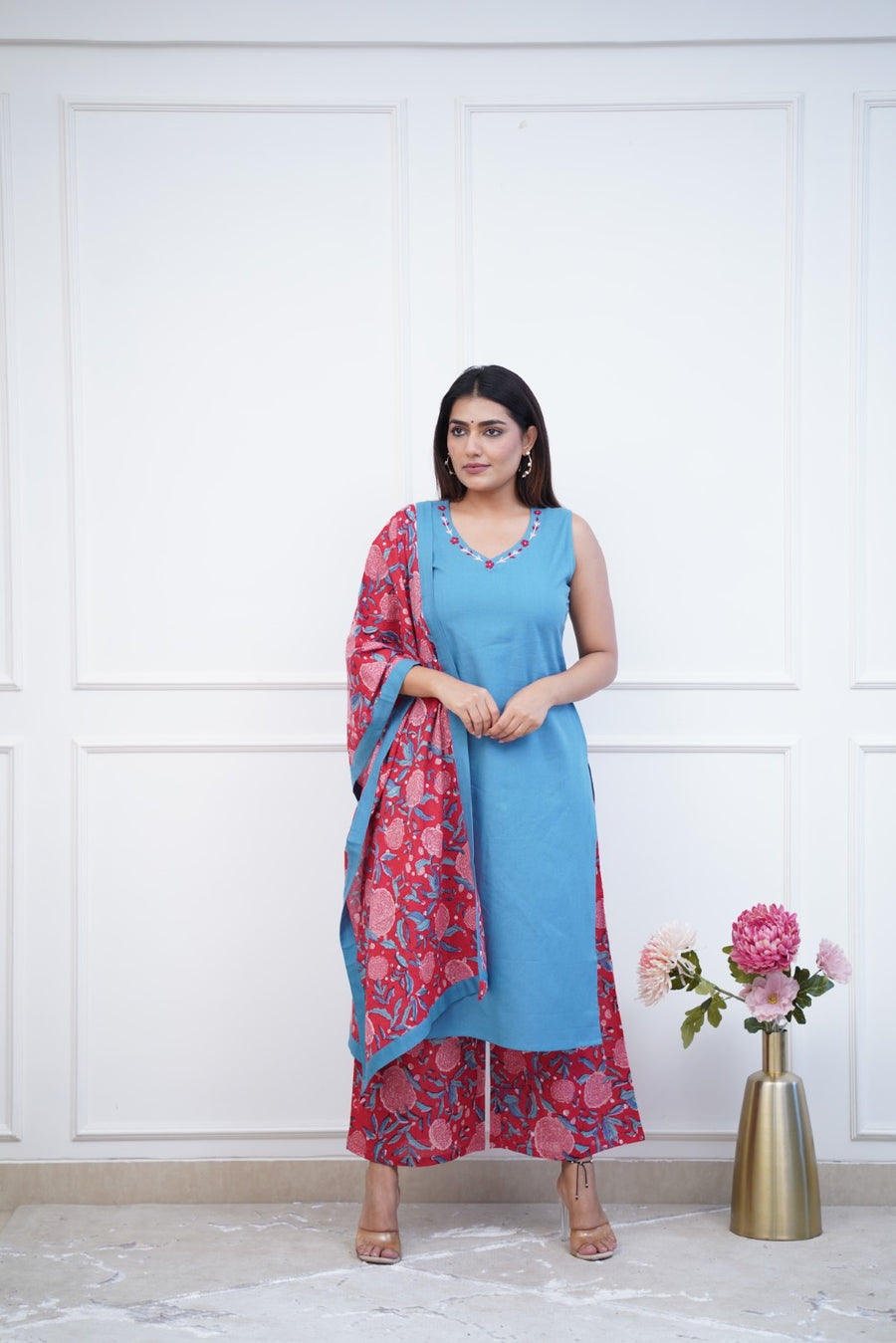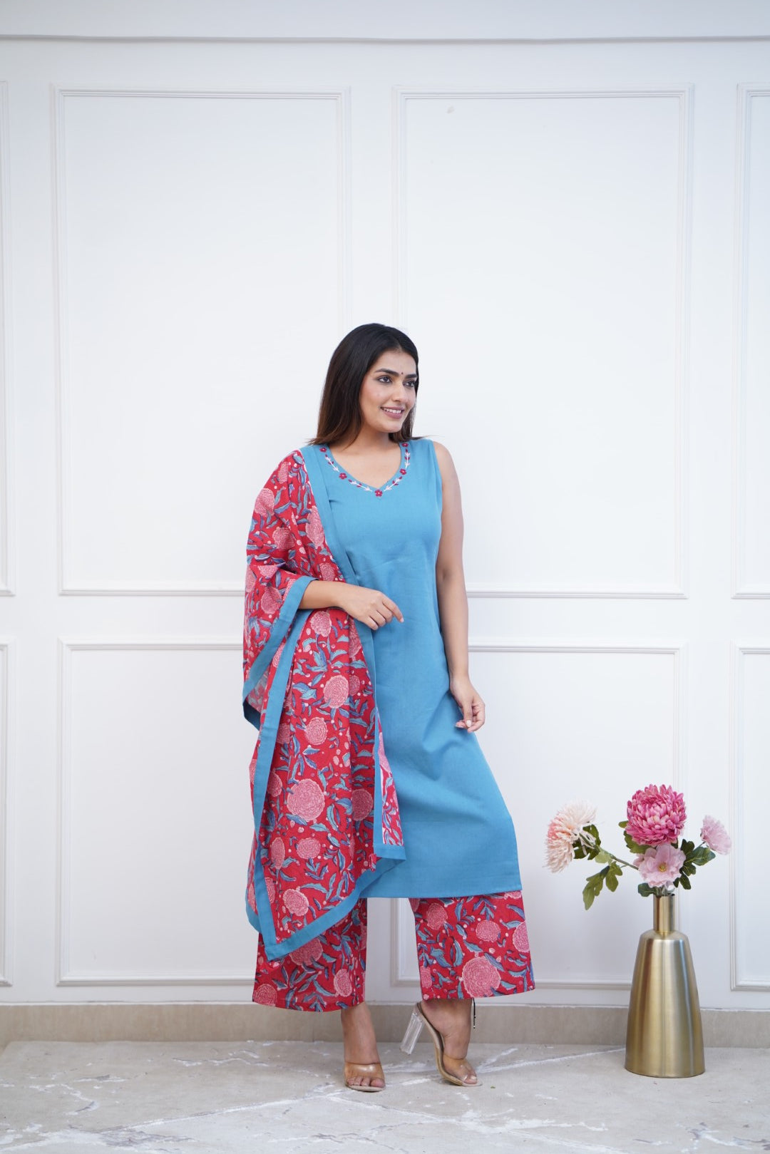 Expertly crafted Sleeveless Dupatta Sets made with high-quality cotton fabric. Available in sizes 36-44, with a kurta length of 46 inches and attached 3/4 sleeves for added comfort. Stylish pant length of 38 inches and a stole style dupatta for a chic look. Perfect for any occasion.