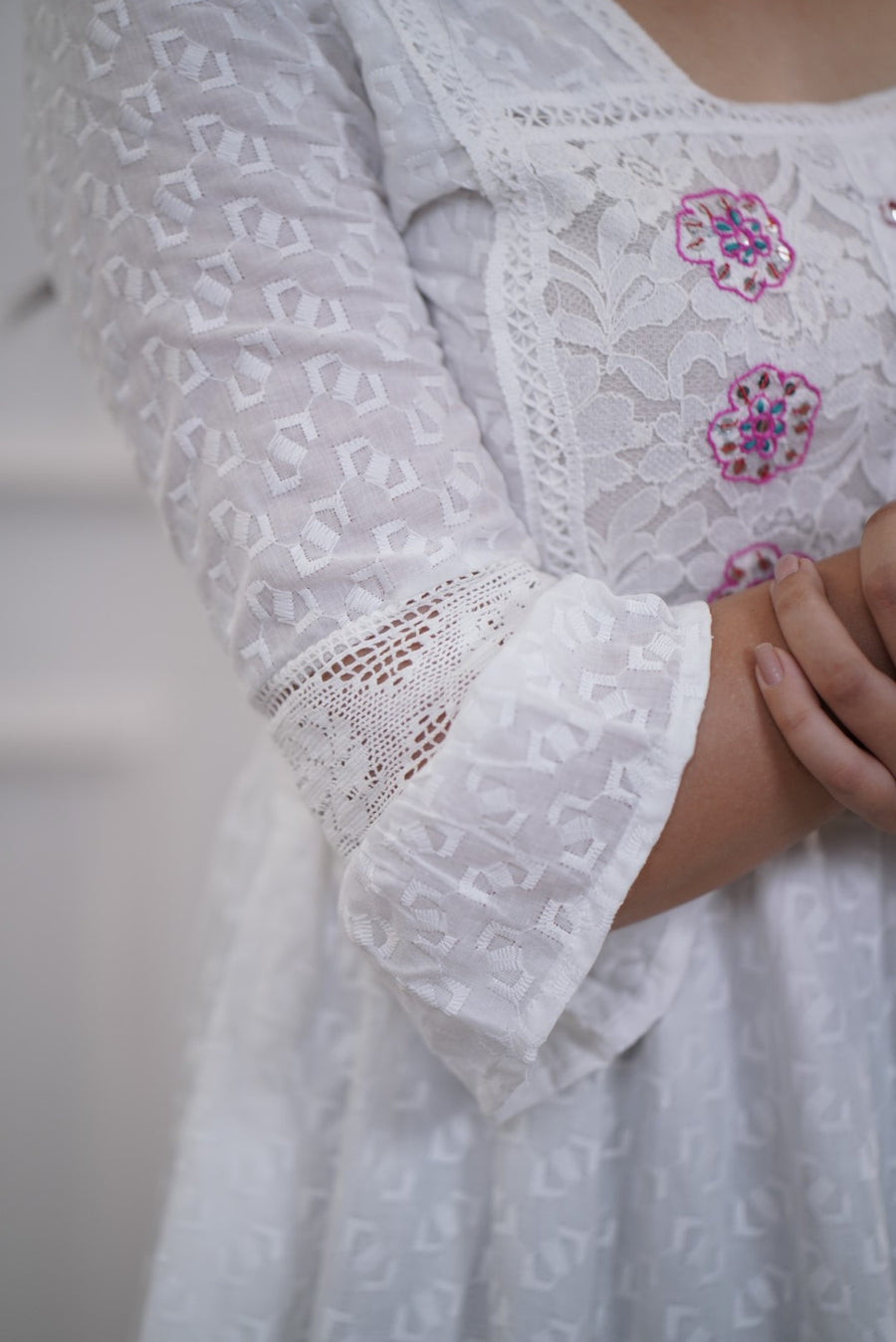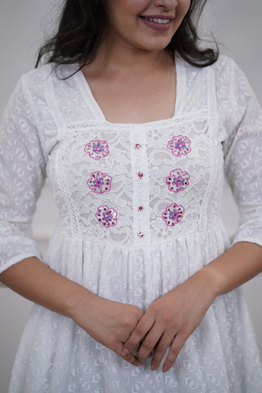 Cotton laced dress with lining. Floral embroidery with pink and purple flowers on the bust area. The dress has a light, summery feel, perfect for casual or semi-formal daytime occasions.