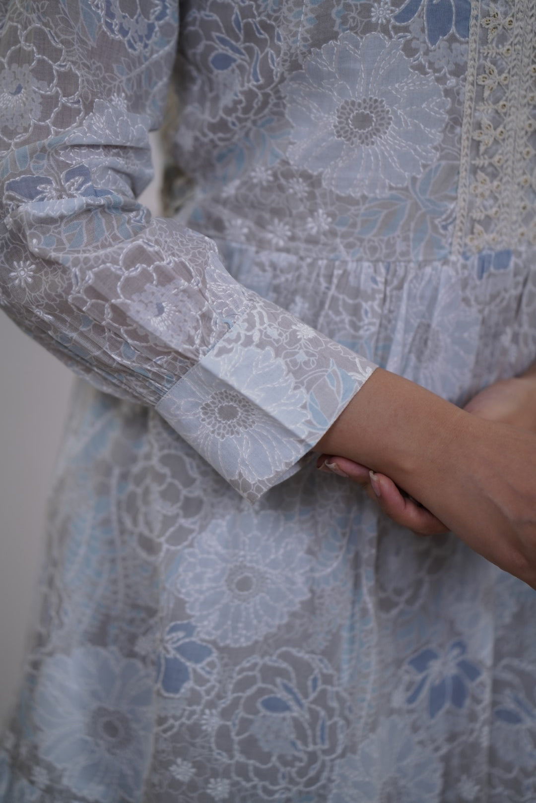 Lace overlay with a likely soft cotton or polyester inner lining. High, round neckline (crew neck). Full sleeves. All-over lace fabric with a patchwork-style pattern.