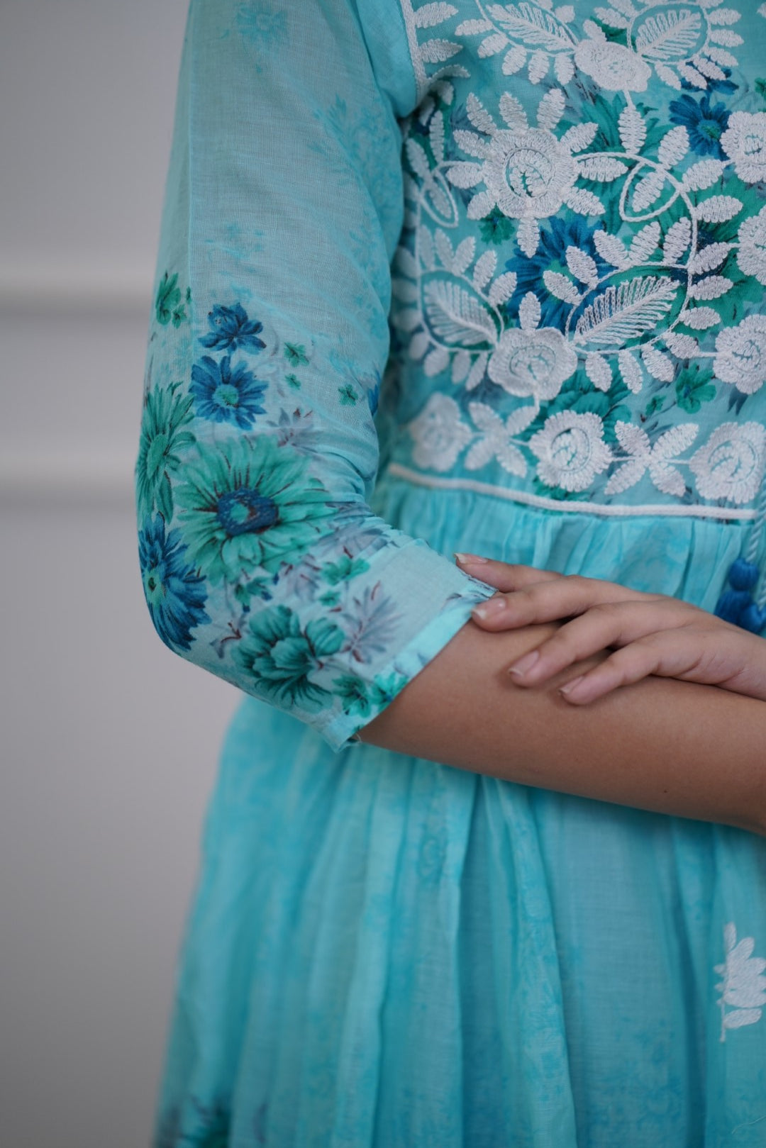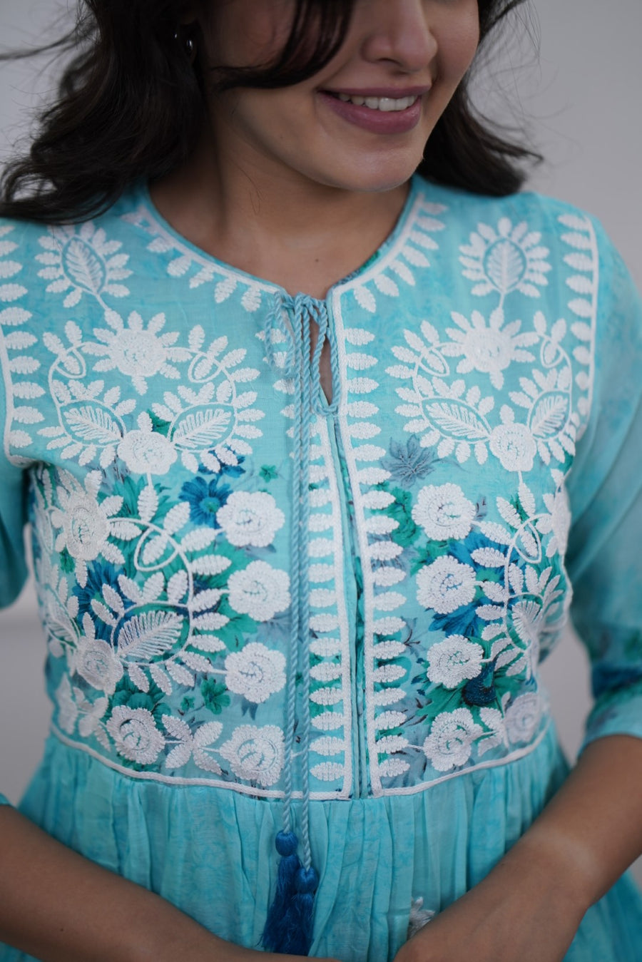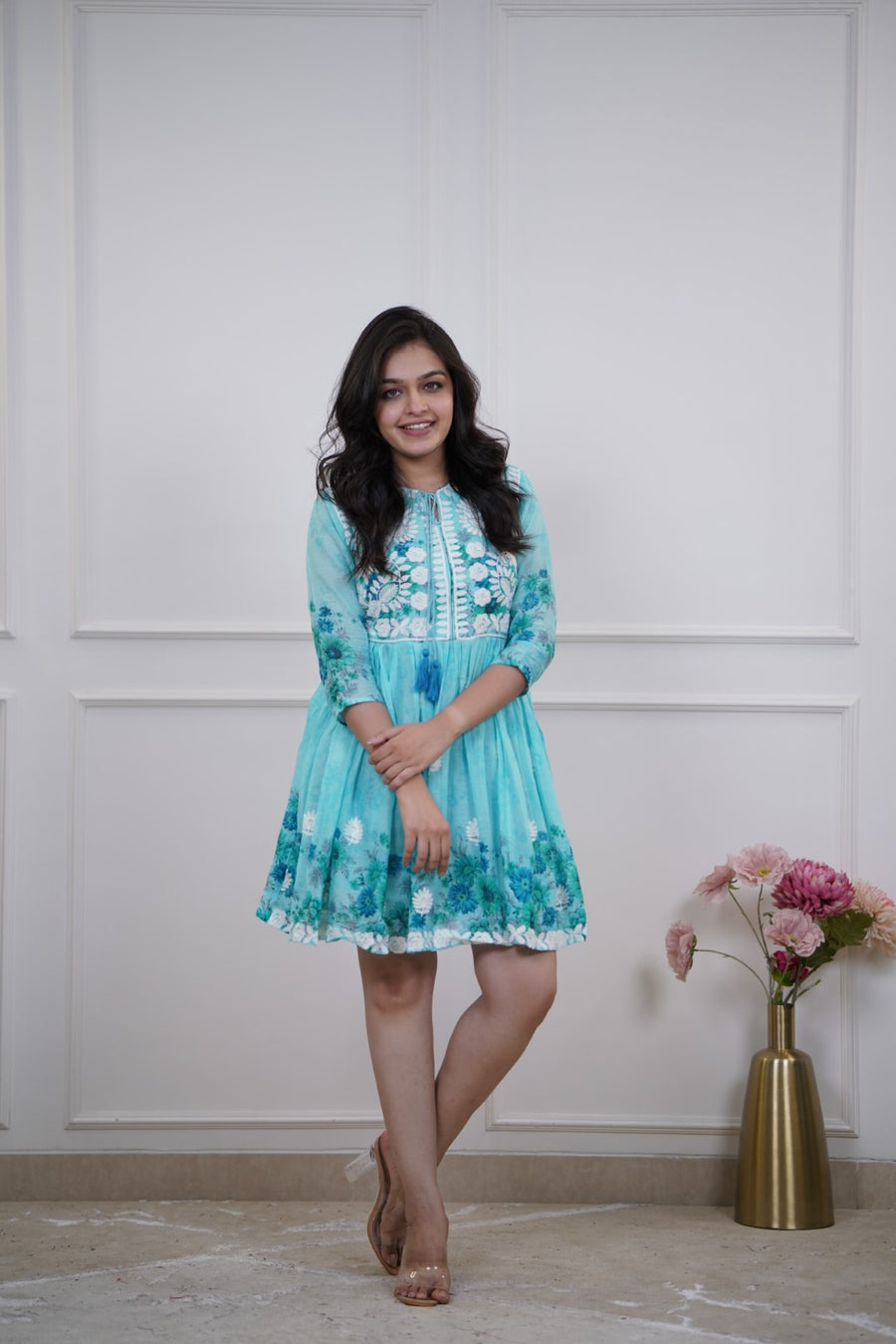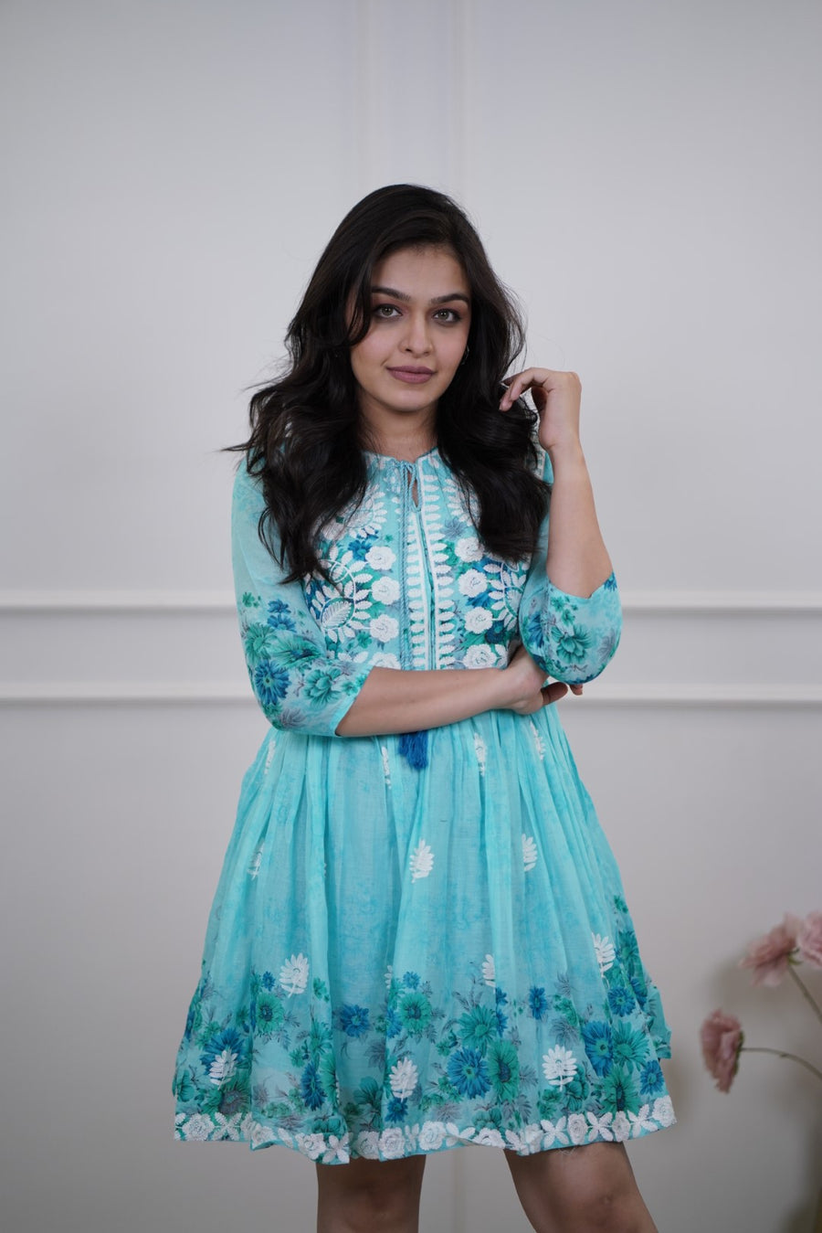 Mul cotton with Lakhnavi Work . Empire-waist flared mini dress. Round neckline with a keyhole cutout and tie-up tassels. Above-the-knee, with floral border embroidery. Heavily embroidered bodice with white and blue floral motifs. Casual summer outings.