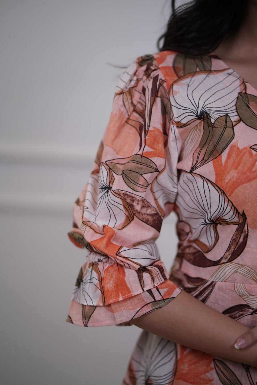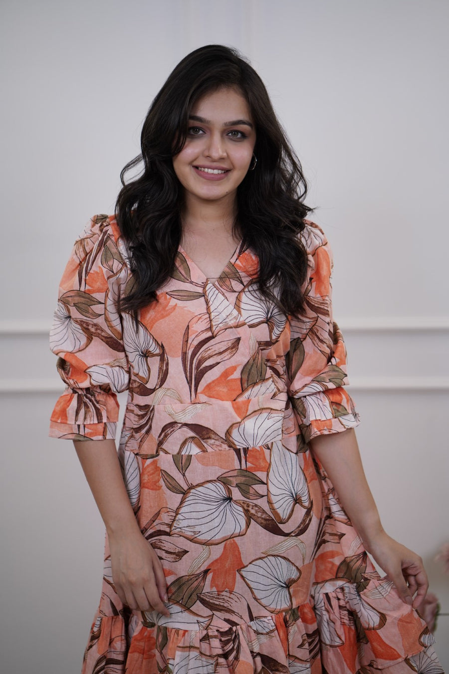 A-line, knee-length dress with a relaxed, feminine silhouette. V-neck. Three-quarter sleeves with a gathered, slightly puffed look near the cuffs. The fabric features a tropical or botanical print with large leaves in shades of peach, orange, brown, and white. Fabric Cotton.