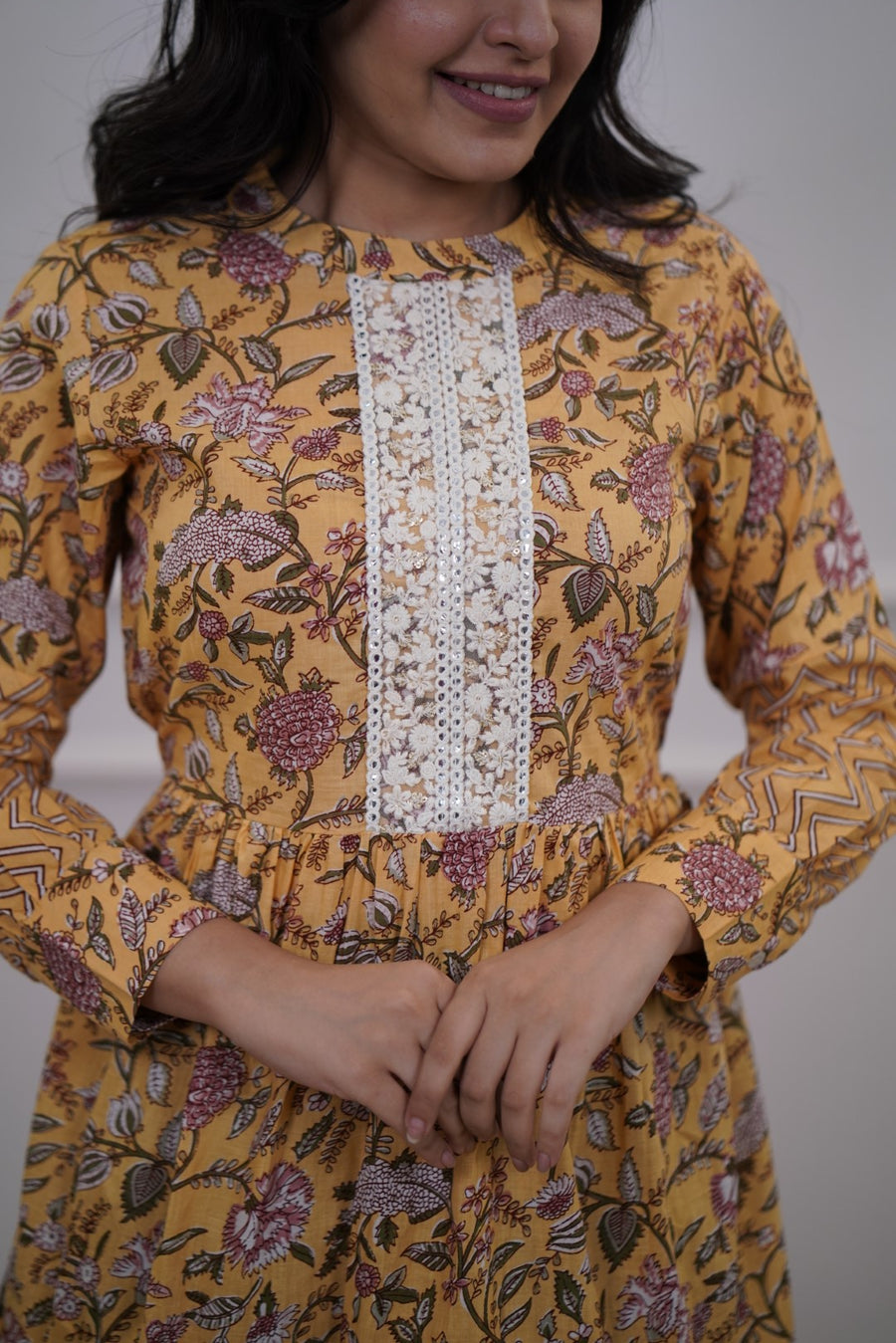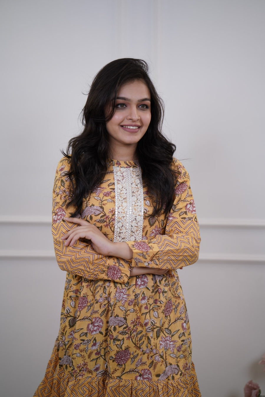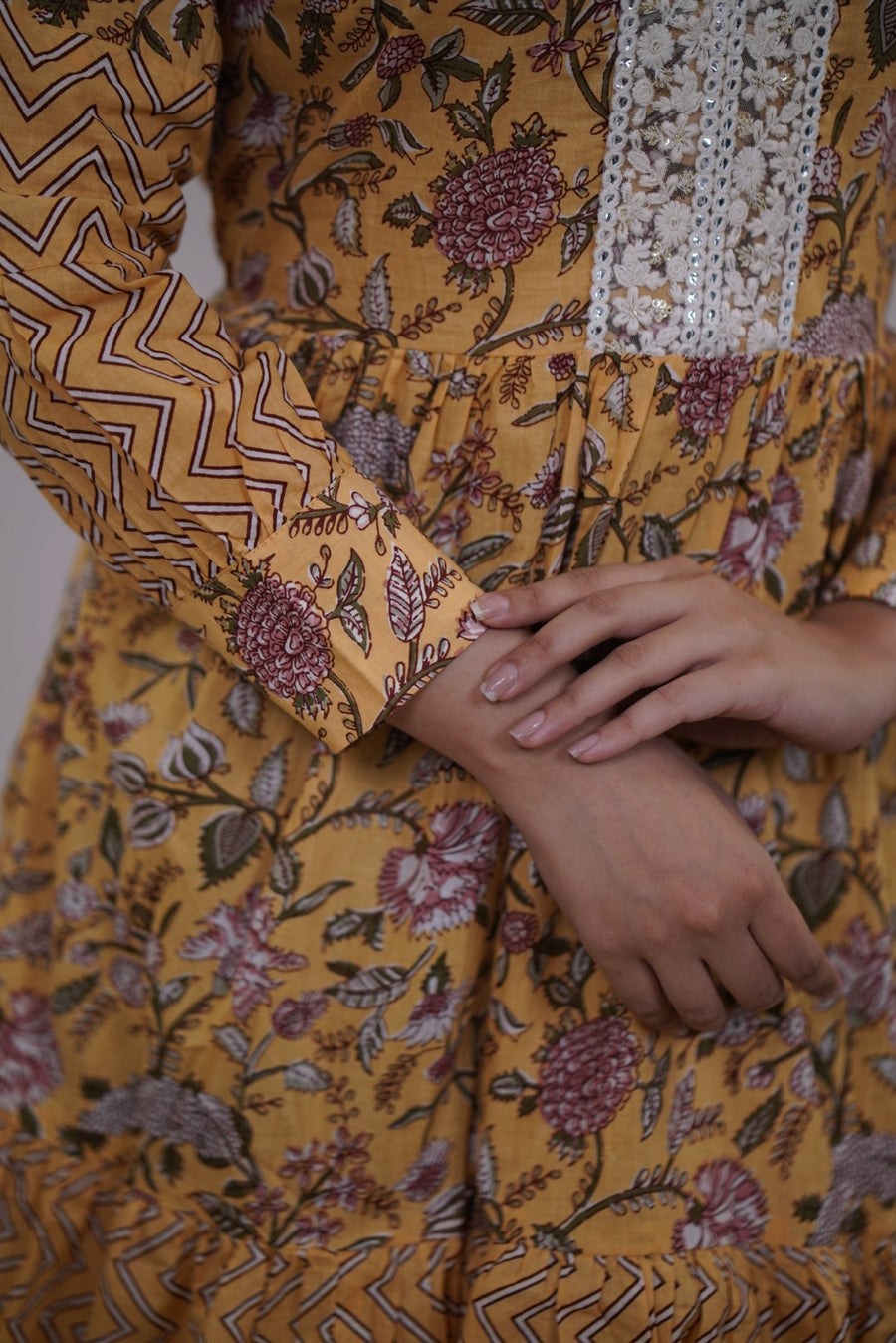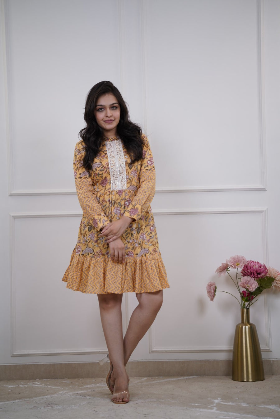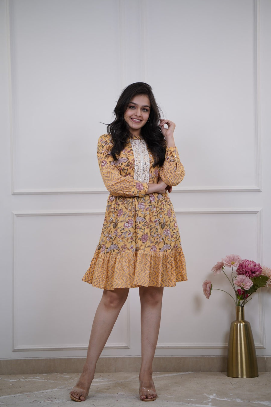 A-line short dress with a gathered waist for a soft flare. Crafted from a lightweight, breathable Cotton fabric. Base color: Warm mustard yellow. Features a contrasting wide flounce hemline in a chevron zigzag print (orange & pink tones) that adds volume and movement.