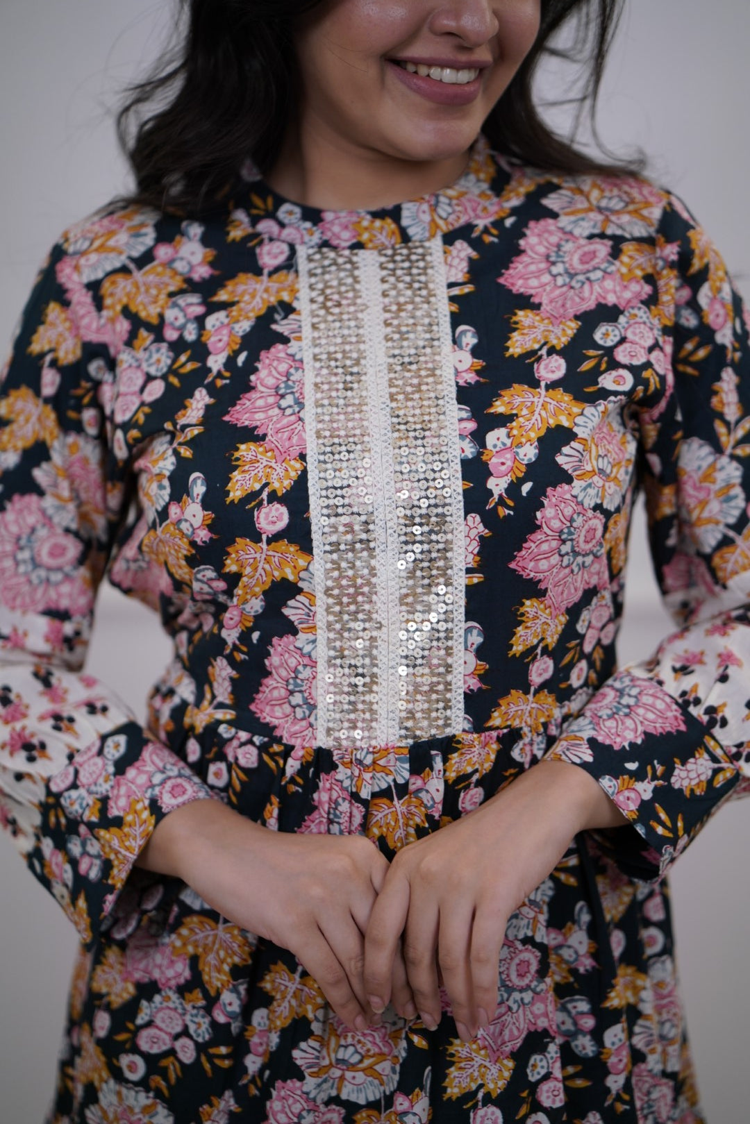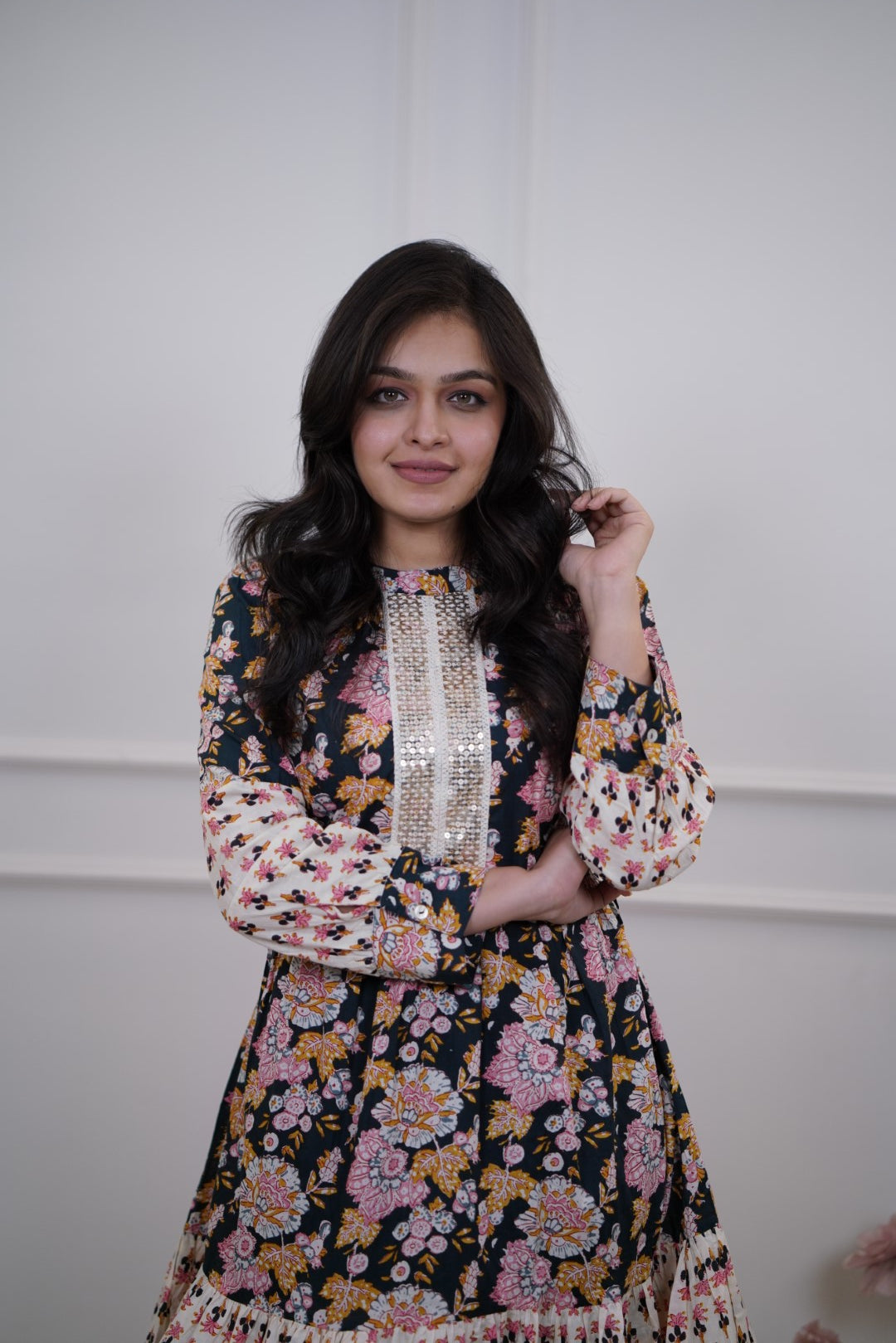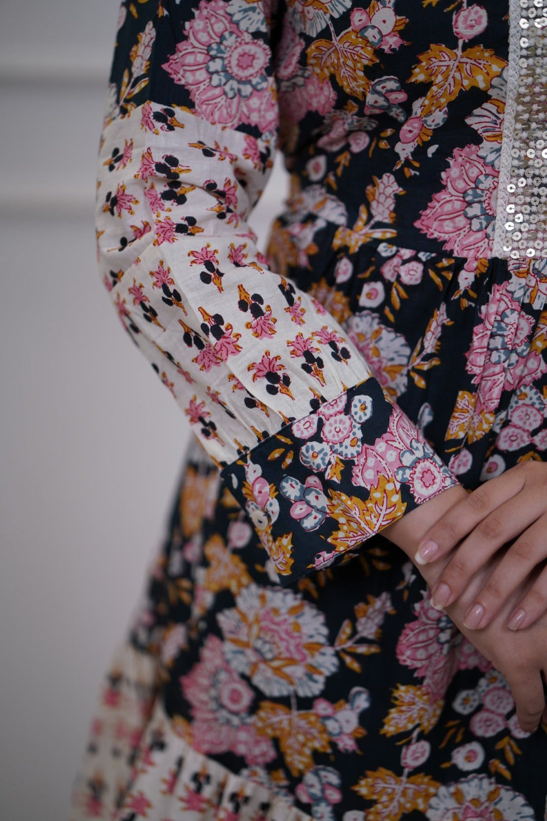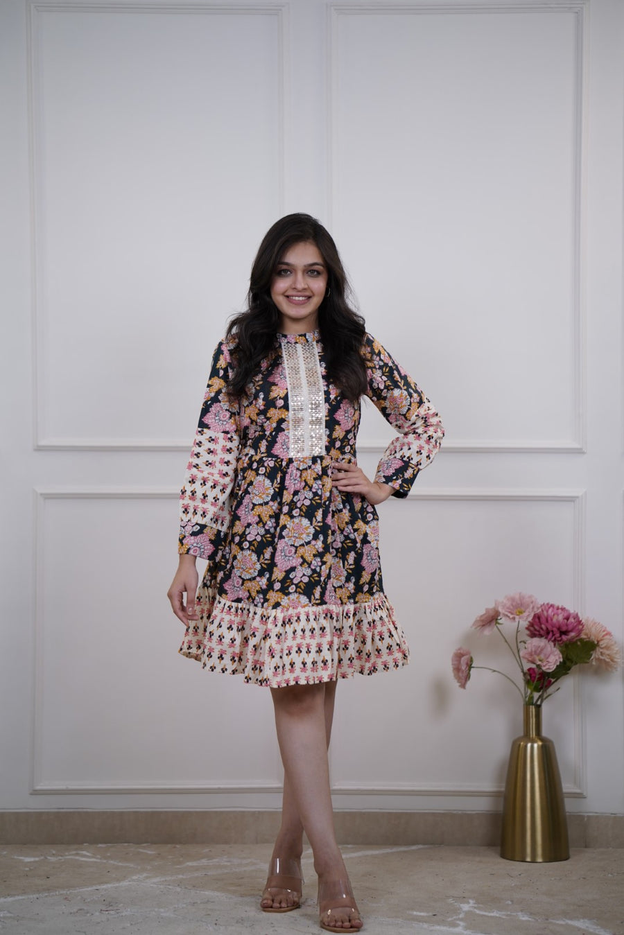 A-line short dress with a gathered waist for a soft flare. Crafted from a lightweight, breathable Cotton fabric. Base color: Black. Features a contrasting wide flounce hemline in a chevron zigzag print (orange & pink tones) that adds volume and movement.