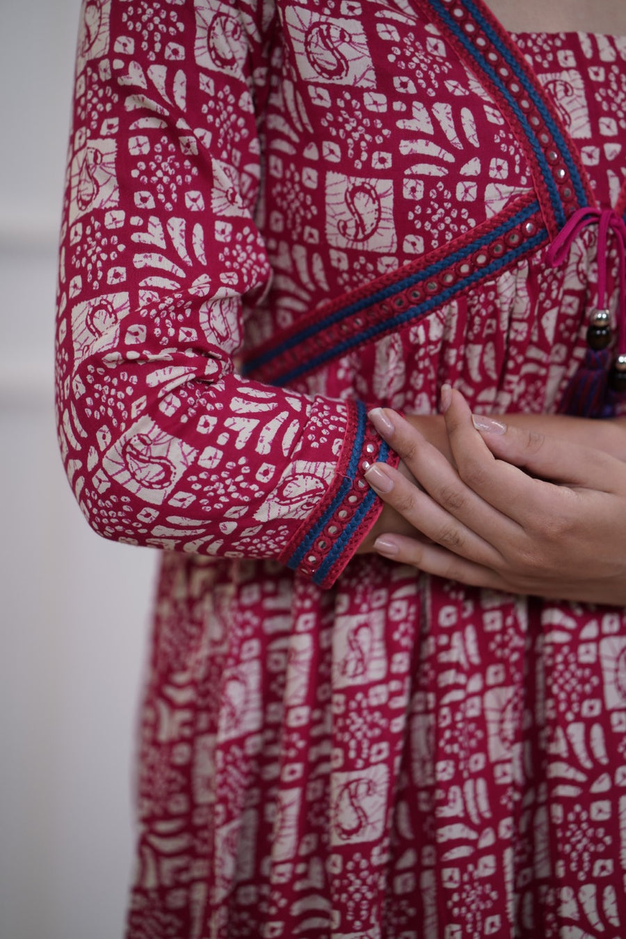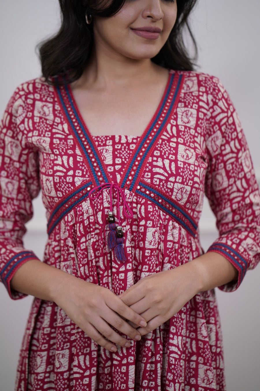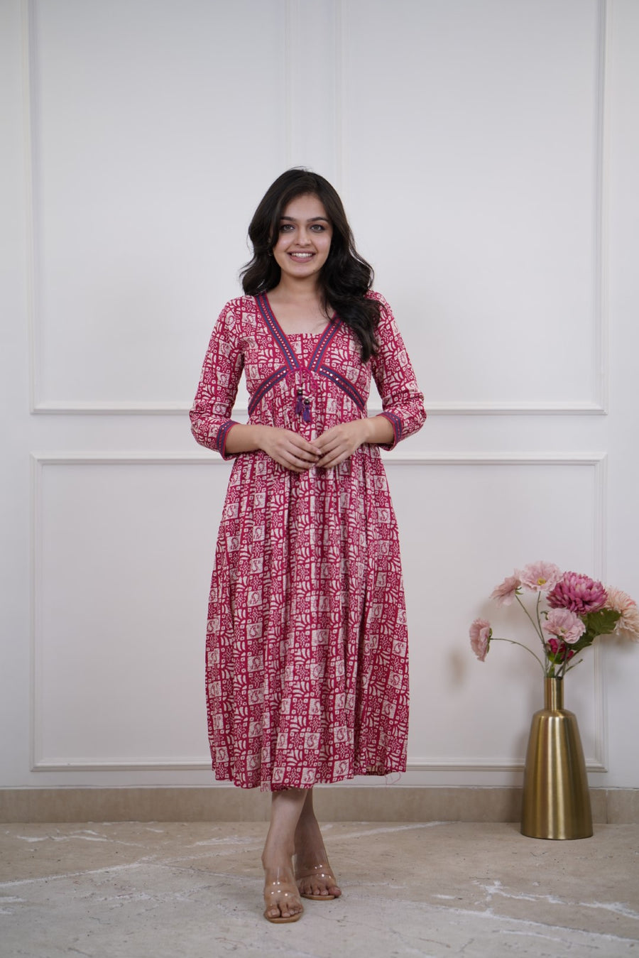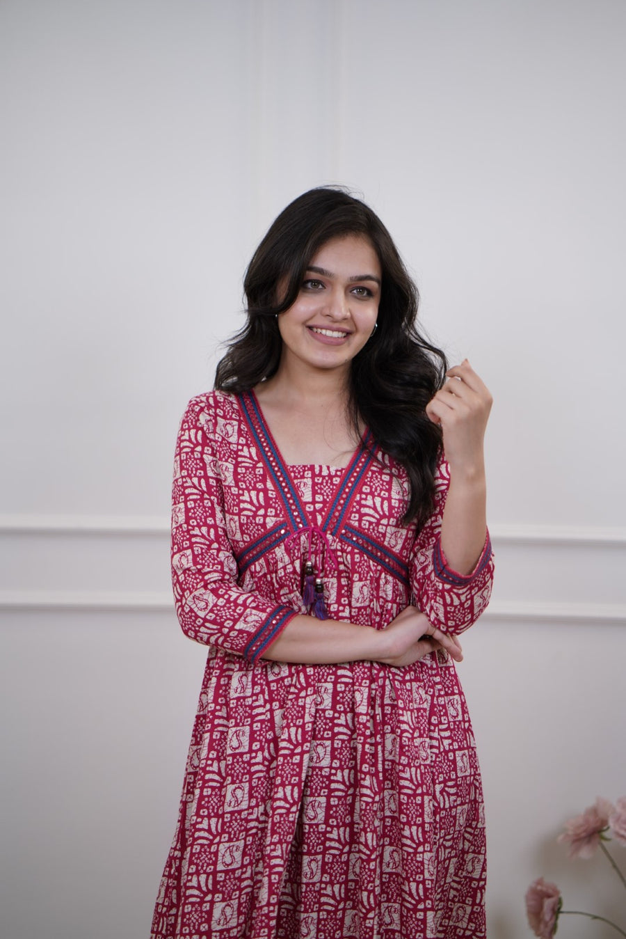 This dress showcases a vibrant, ethnic-inspired aesthetic. Made from a soft Heavy Rayon in a deep magenta/red base with a block-printed white motif throughout. All-over abstract or tribal-style block print with a consistent geometric pattern. V-shaped neckline with decorative dark pink piping and a criss-cross yoke design featuring tassel tie-ups at the center.