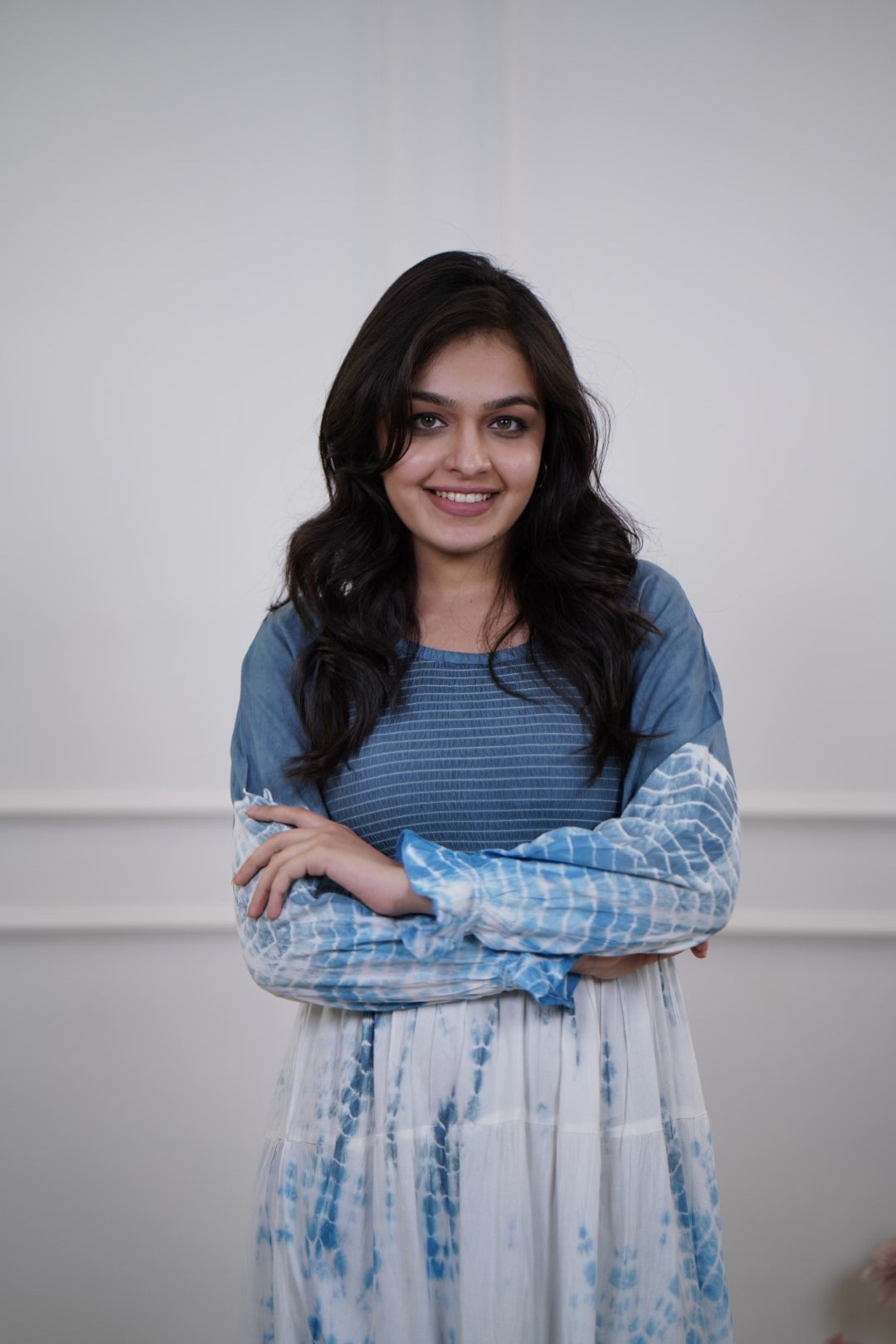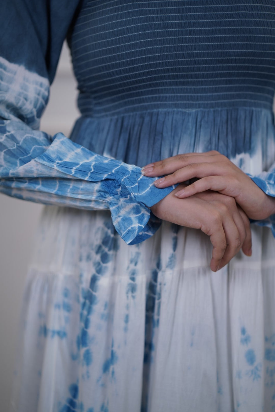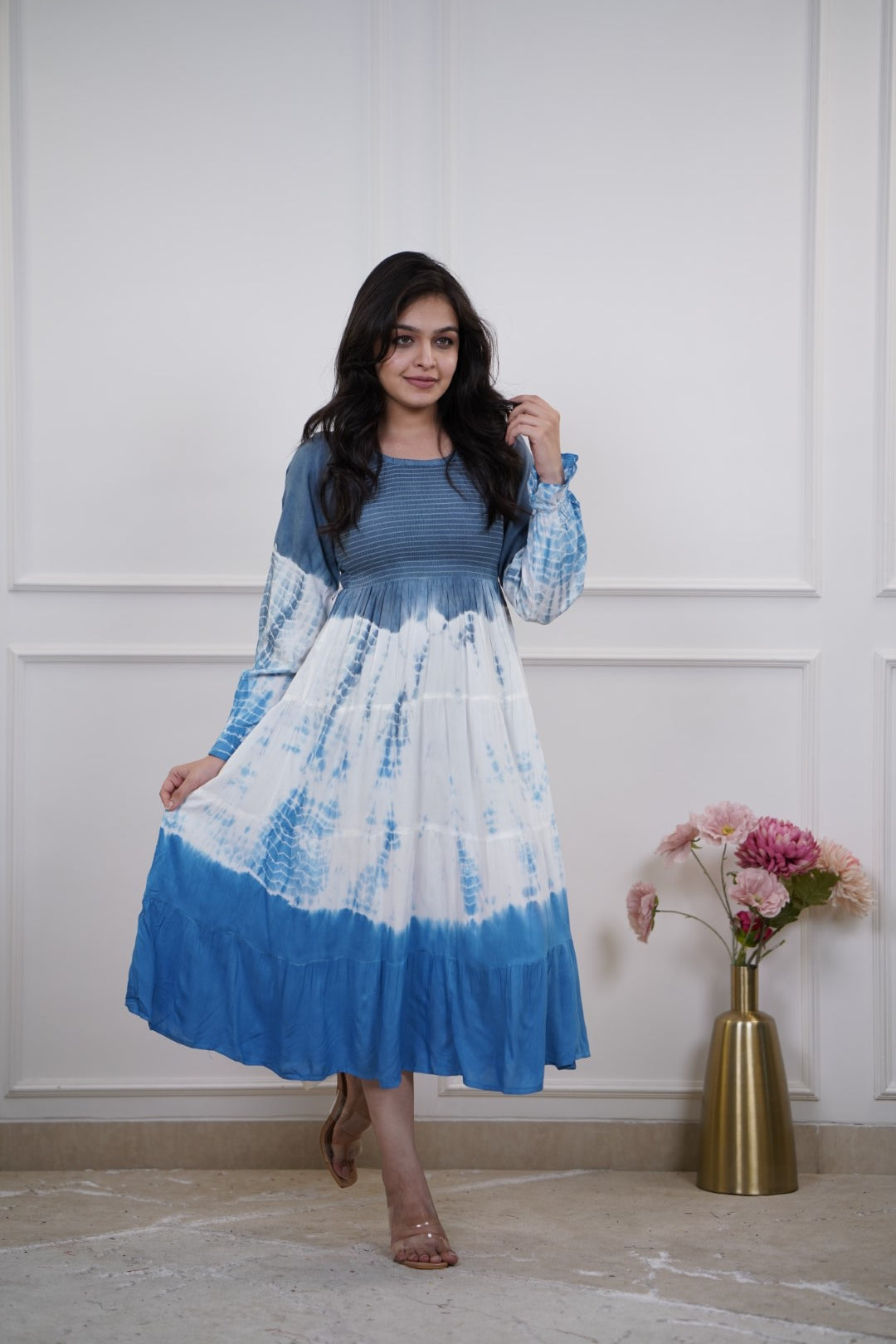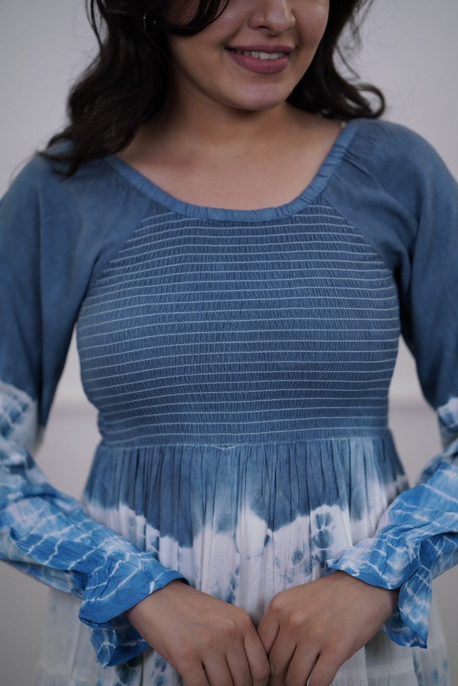 This dress blends comfort with a breezy bohemian aesthetic. The color transitions from deep blue at the top and hemline to white in the center with blue tie-dye effects. A dip-dye or shibori-inspired pattern that gives a handcrafted, artistic vibe. Rounded neckline with pin-tuck detailing on the bodice, adding texture and interest.