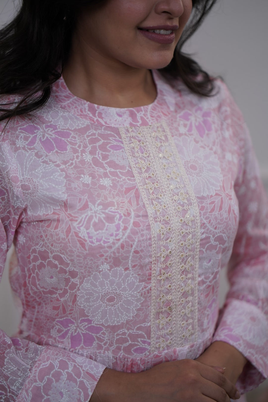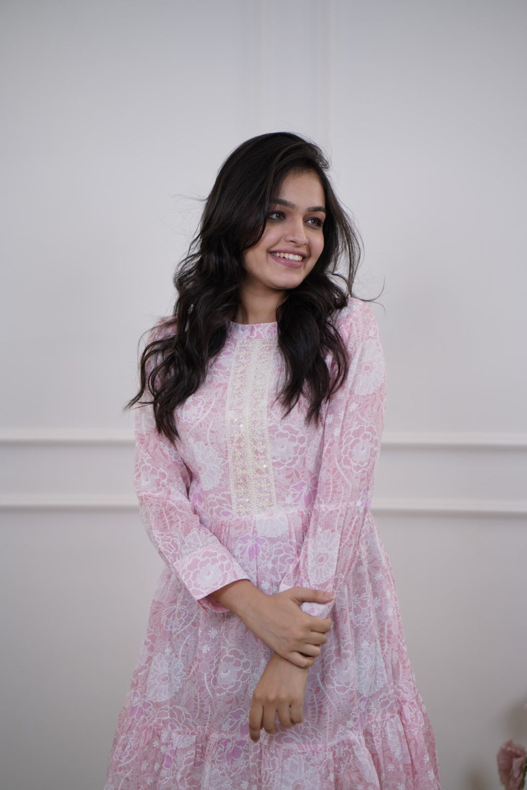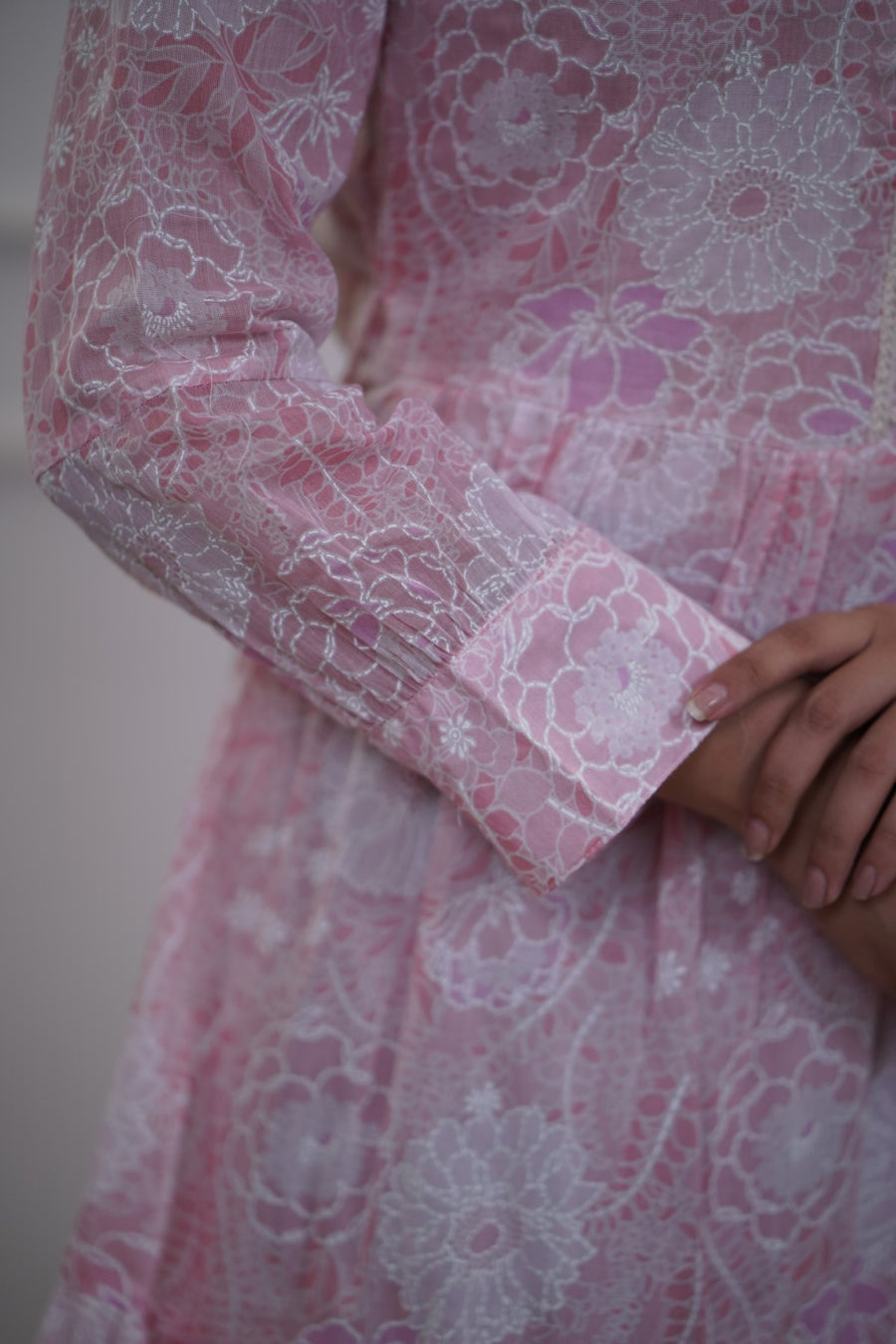 The dress in the image is a delicate and feminine piece. Predominantly light pink with white floral lace patterns. Lace overlay featuring floral embroidery, giving it a textured, elegant look. Round neckline with a subtle central lace panel featuring vertical embroidery detailing. Long sleeves with slight puff at the shoulders, ending in wide cuffs.